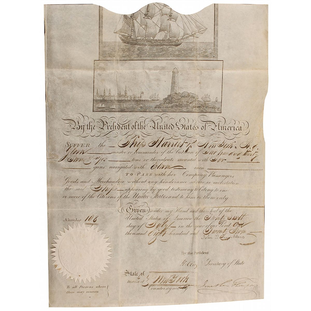 Vellum DS as president, signed “John Quincy Adams,” one page, 11 x 14.5, July 26, 1827. Scallop-top ship’s papers. In part: “By the President of the United States of America, Suffer the Ship Harriet of New York, R. C. Glover master or commander of the burden of two hundred thirty seven tons or thereabouts mounted with two guns navigated with Eleven men, To Pass with her Company, Passengers, Goods and Merchandise without hindrance.” Signed at the conclusion by Adams and countersigned by Secretary of State Henry Clay. The white wafer seal is intact. Intersecting folds, some wrinkling and creasing, scattered soiling and toning, and writing visible on opposing sides, otherwise fine condition.