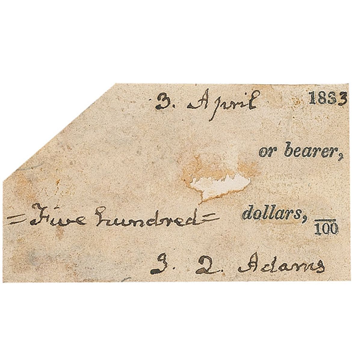 Partial check, 2.5 x 1.5, filled out and signed by Adams, “J. Q. Adams,” for $500.00, April 3, 1833. Check portion is affixed to a 5 x 4 off-white sheet. In very good condition, with trimmed edges and diagonal top left corner, paper loss to center, and scattered toning and soiling. According to his diaries, on April 2, John Quincy Adams ‘received an order from John A. Smith for the payment of 500 dollars of the bequest from my father to him—which I accepted.’ The following day Adams records how he walked ‘to the U.S. Branch Bank where my son had paid the draft of J. A. Smith for 500 dollars; and where I took my Bank Book that the entry might be made both to my debt and credit for a record of the transaction.’ Partially printed examples of early presidents are significantly rarer than their manuscript counterparts, with this check made even more desirable by being mentioned in his personal diary.
