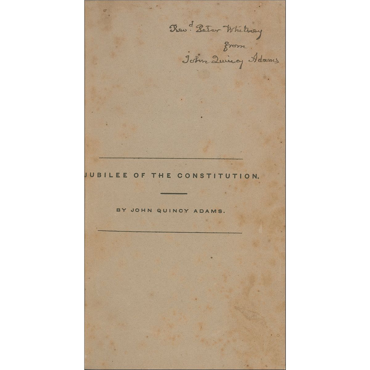 Signed book: Jubilee of the Constitution; Removal of the Public Deposites and its Reasons; An Argument Before the Supreme Court; and several reports. Privately printed. NY: Samuel Colman, 1839. Rebound hardcover with leather spine, 5.5 x 9. Signed on the half-title page, “Recd. Peter Whitney from John Quincy Adams.” Scattered toning and foxing to signed page and some of the inside pages, scattered toning and soiling to pastedowns, spine a bit weak, and light chipping and wear to covers, otherwise very good condition. Adams’ signature is bold and crisp.