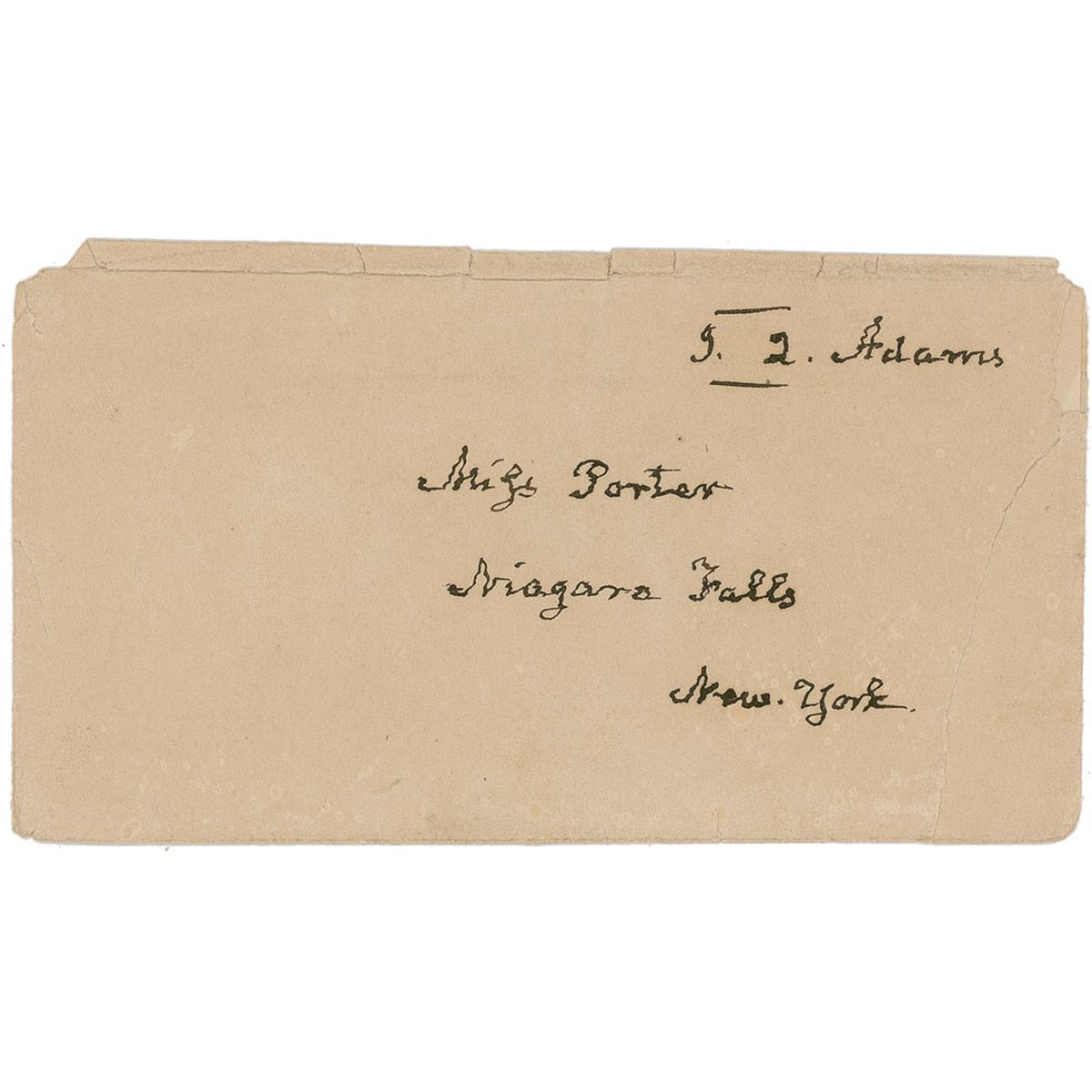 Hand-addressed and free franked envelope, 5.75 x 3.25, addressed in Adams’s hand to “Miss Porter, Niagara Falls, New York,” and franked in the upper right, “J. Q. Adams.” Paper loss to lower right corner, uniform toning, and scattered light creasing and wrinkling, otherwise fine condition.