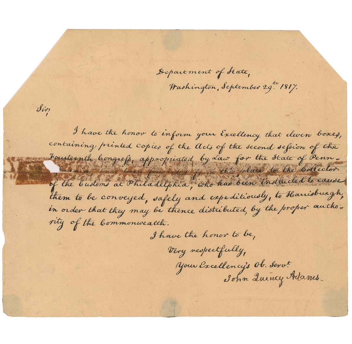 LS, one page, 7.5 x 6.5, September 29, 1817. Just days after assuming the role of Secretary of State, Adams writes from Washington, in full: “I have the honor to inform your Excellency that eleven boxes containing printed copies of the Acts of the second session of the Fourteenth Congress, appropriated by Law for the State of Pennsylvania, have been forwarded from this place to the Collector of the Customs at Philadelphia, safely and expeditiously, to Harrisburgh in order that they may be thence distributed by the proper authority of the Commonwealth.” In very good condition, with show-through from a heavy strip of adhesive remnant to the reverse, securing the previously separated two halves of the letter, a small area of paper loss, and both the top corners clipped.