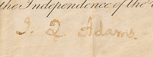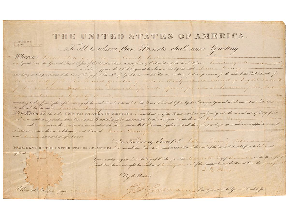 Partly printed DS as president, signed “J. Q. Adams,” one page on vellum, 15.5 x 9.75, December 20, 1826. A grant for a parcel of 80 acres of land near Indianapolis issued to Isaac Drury, signed at the conclusion by Adams, and countersigned by Commissioner of the General Land Office George Graham. In good condition, with heavy intersecting folds (vertical fold to last name; a few small holes), toning, wrinkling, and ink a shade light but fully legible, as is the signature. The seal remains cracked, but mostly intact.