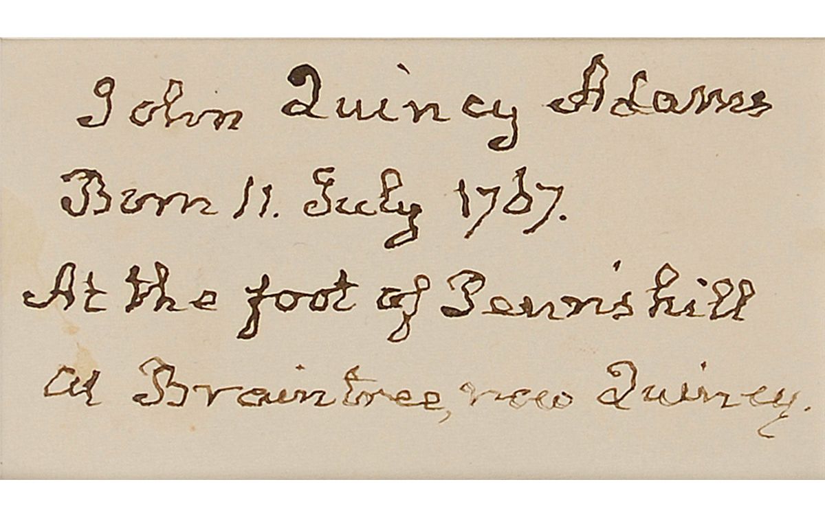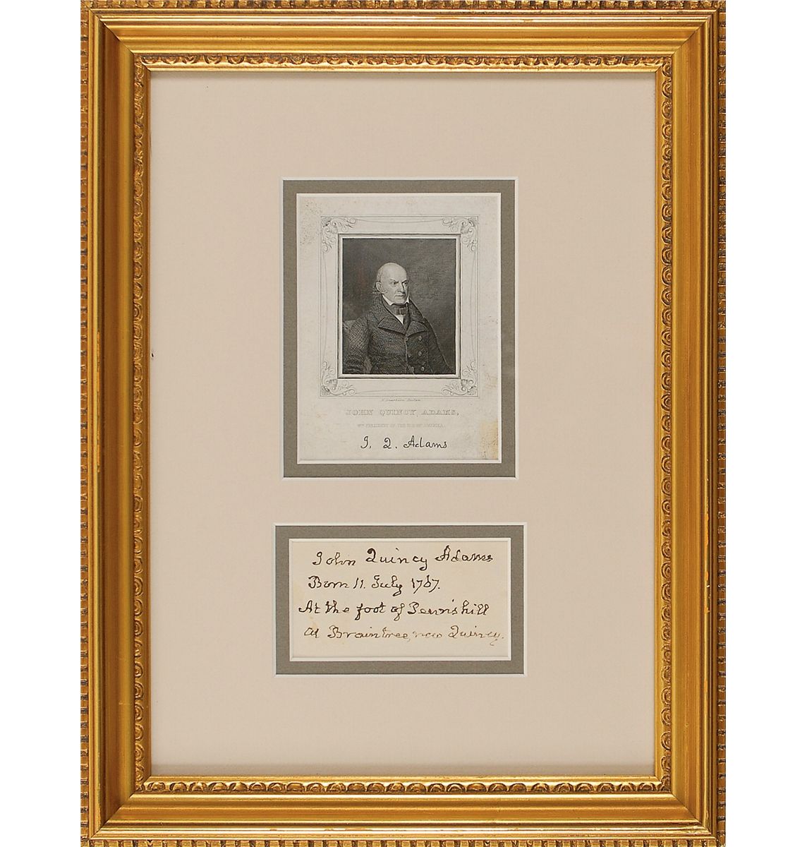 Ink signature, “John Quincy Adams, Born 11 July 1767, At the foot of Penn’s Hill, at Braintree, now Quincy,” on an off-white 3.25 x 1.75 slip. Double matted and framed with an engraved portrait to an overall size of 9.5 x 12.75. In fine condition, with a bit of scattered light soiling.