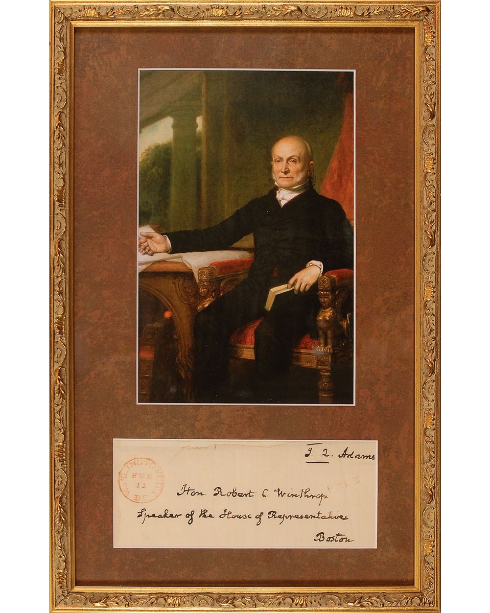 Hand-addressed and free franked address panel, 7 x 3, addressed by Adams to “Hon. Robert C. Winthrop, Speaker of the House of Representatives, Boston,” and franked in the upper right, “J. Q. Adams.” Panel also bears a light, but legible “Free” stamp below the franking signature and a date stamp, “Feb. 11,” to the left side. Matted and framed with a portrait of Adams to an overall size of 10 x 16. Light intersecting folds, including one touching a single letter of the signature, a uniform shade of toning, and an unobtrusive repair to paper loss along top edge, otherwise fine condition.