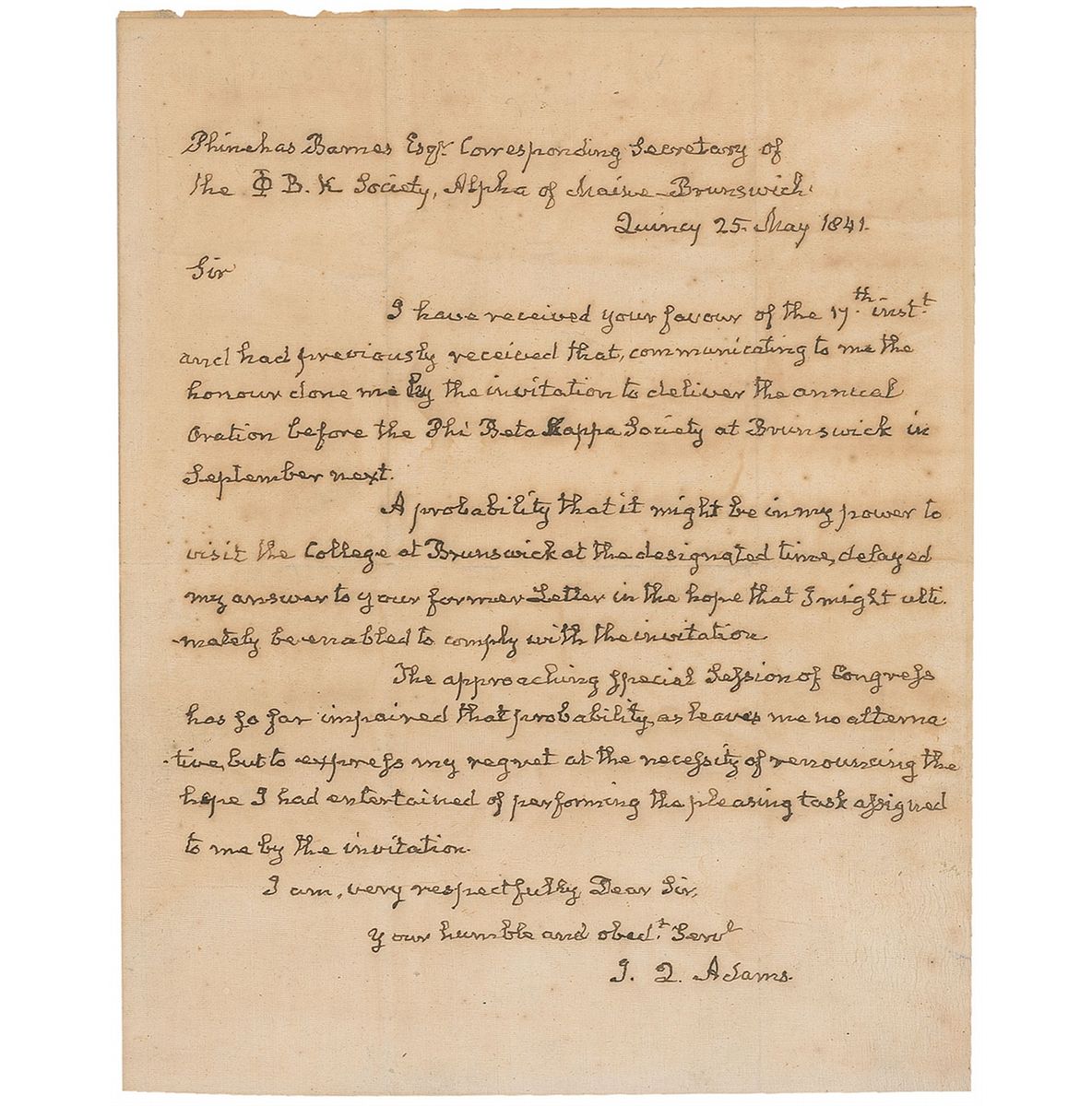 ALS signed “J. Q. Adams” with “Quincy” [Massachusetts] given as his location, one page, 7.75 x 10, May 25, 1841. Letter to Phinehas Barnes, regretfully declining a speaking invitation. In full: “I have received your favour of the 17th inst. and has previously received that, communicating to me the honour done me by the invitation to deliver the annual oration before the Phi Beta Kappa Society at Brunswick in September next. A probability that it might be in my power to visit the College at Brunswick at the designated time, delayed my answer to your former letter in the hope that I might alternately be enabled to comply with the invitation. The approaching special session of Congress has so far impaired that probability and leaves me no alternative but to express my regret at the necessity of renouncing the hope I had entertained of performing the pleasing task assigned to me by the invitation.” In very good condition, with intersecting folds, moderate scatted toning and slight foxing, and its having been professionally silked. Adams was returning to Congress to oppose John Tyler’s ascension to the presidency upon the death of President Harrison—he challenged President Tyler’s assumed title, believing that he should remain ‘Vice President,’ ‘Acting President,’ or even ‘Vice President now exercising the office of President.’ Having once been president himself, Adams would have had keen insight into the Constitutional crisis taking place. A bold and clear letter from one of the most vocal leaders of the dispute.