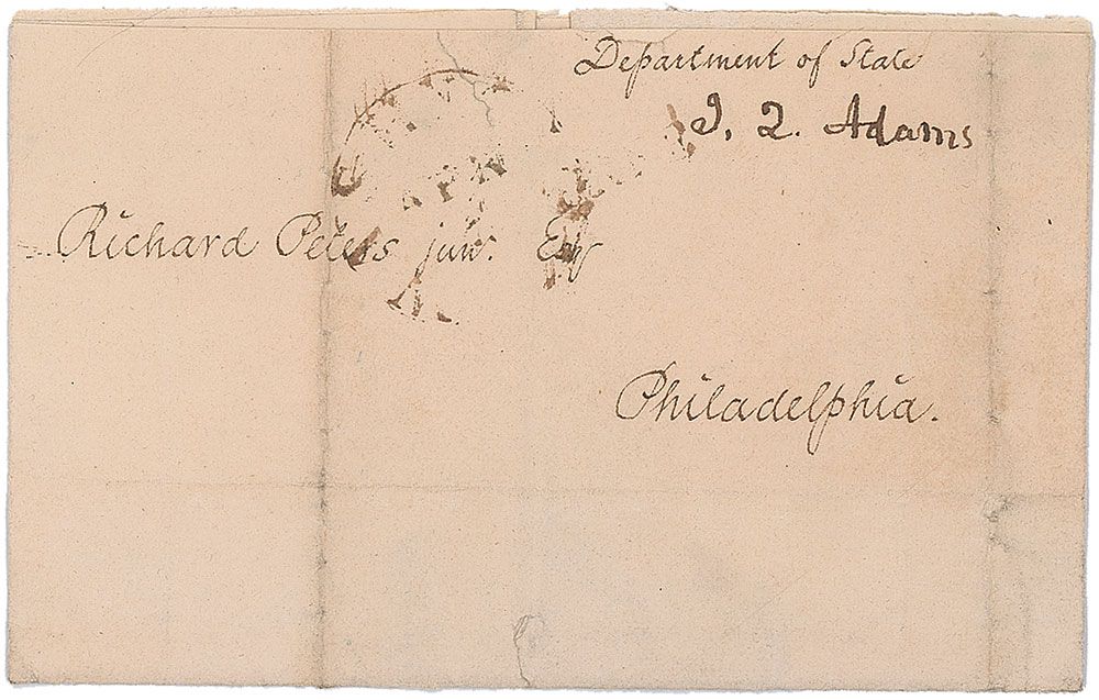 Free frank, measuring 9.75 x 6 unfolded, and panel measuring 4.75 x 3, addressed in an unknown hand to “Richard Peters, jun, Esqr, Philadelphia,” and franked in the upper right, “J. Q. Adams.” Intersecting folds, scattered light creases and wrinkles, and a postmark over portion of address, otherwise fine condition.