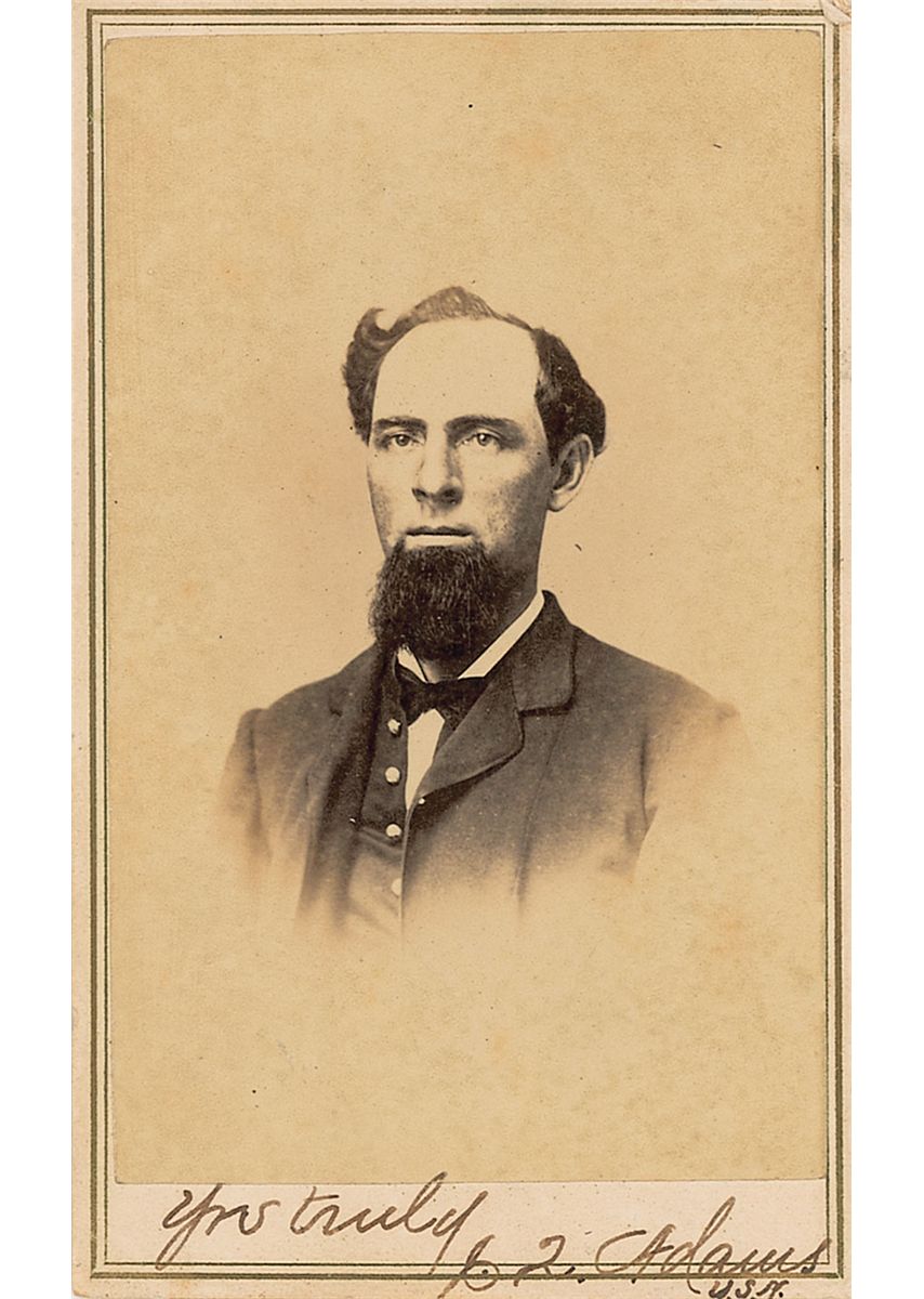 Enlisted in the US Navy in 1861 and served on board the receiving ships Ohio and St. Lawrence. Original 2.25 x 4 carte-de-visite photo by an anonymous studio, signed in the lower border in black ink, “Yrs truly, J. Q. Adams, U.S.N.” In fine condition, with a bit of scattered light soiling. and some light contrast to signature.