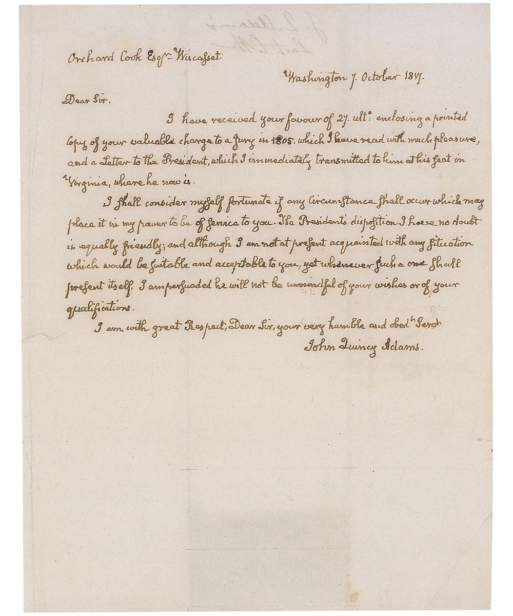 ALS, as secretary of state, one page, 7.5 x 10, October 7, 1817. Letter to Orchard Cook. In part: “I have received your favour…enclosing a printed copy of your valuable charge to a jury in 1805, which I have read with much pleasure, and a Letter to the President, which I immediately transmitted to him at his Seat in Virginia, where he is now. I shall consider myself fortunate if any circumstance shall occur which may place it in my power of service to you. The President’s disposition I have no doubt is equally friendly; and although I am not at present acquainted with any situation that would be suitable or acceptable to you, yet whenever such a one shall present itself, I am persuaded he will not be unmindful of your wishes or of your qualifications.” In fine condition, with light intersecting folds. Accompanied by an unsigned engraving. Cook was a three-time congressman from Massachusetts from 1805–1811 and later served as postmaster of Wiscassett, Maine from 1811 until his death in 1819. Adams was forwarding the copy to president James Monroe, elected earlier in the year, and had just sold his land to the University of Virginia, perhaps referenced as his “Seat” by Jefferson.