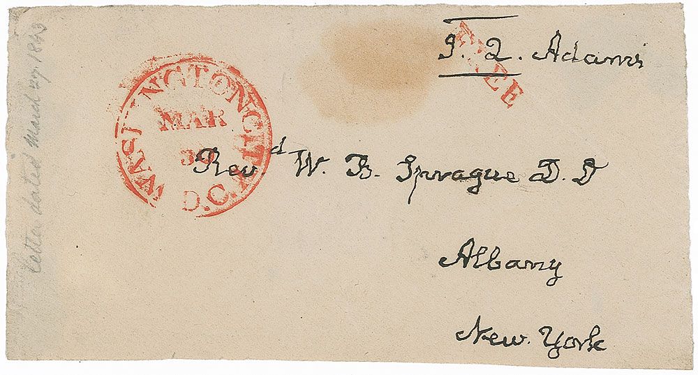 Hand-addressed and free franked mailing panel, 5.25 x 2.75, boldly addressed by Adams to, “Revd W. B. Sprague D. D., Albany, New York,” and franked in the upper right, “J. Q. Adams.” Panel also bears a March 30, Washington, D. C., postal cancellation. In fine condition, with pencil notations to left edge, a “Free” stamp over beginning of franking signature, and some light toning along top.