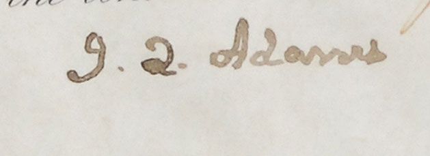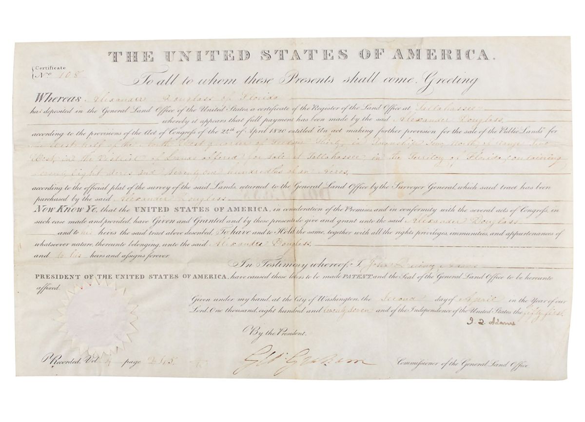 Partly-printed vellum DS as president, signed “J. Q. Adams,” one page, 15.5 x 9.25, April 2, 1827. Land grant issued to Alexander Douglas of Florida for 78 acres of land in the Florida territory. Signed at the conclusion by Adams and countersigned by Commissioner of the General Land Office George Graham. Intersecting folds, expected light rippling, and handwritten portions of document a shade or two light, otherwise fine condition. The white wafer seal is worn, but intact, and Adam’s signature is quite bold.