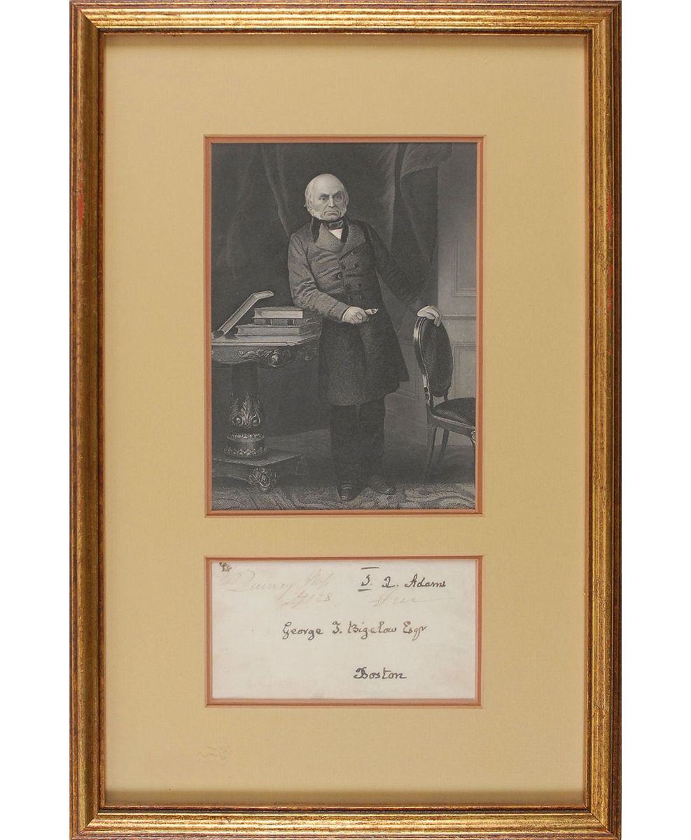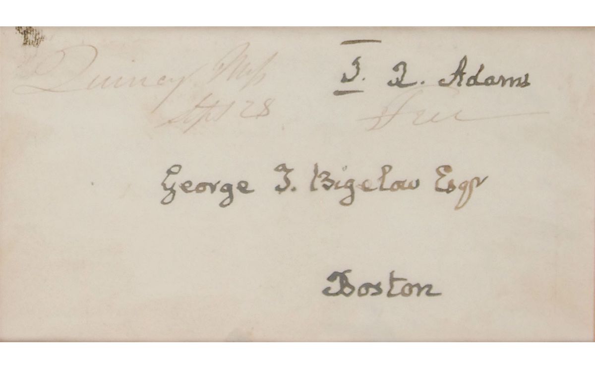 Free-franked mailing panel, boldly addressed by Adams to “George J. Bigelow, Esqr., Boston,” and franked in the upper right, “J. Q. Adams,” with “Free,” and “Quincy, Mass, Sept. 28,” in another hand. Double-matted and framed to an overall size of 11.75 x 16.5. In fine condition, with a light vertical fold to right edge and a small spot of ink to top right. Accompanied by a copy of a 1988 certificate of authenticity from Charles Hamilton.