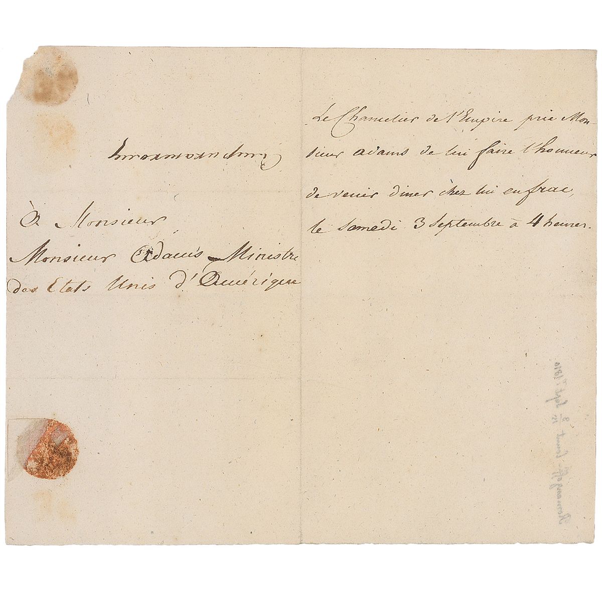 Unsigned docketing notation on the reverse of an invitation to Adams, 8.5 x 7.5, in French, from the Chancellor of Russia inviting Adams to dinner. Adams, serving as US Minister to Russia, dockets the reverse, “Romanzoff–Count 3/15 Septr. 1810.” In fine condition, with wax seal remnants to left edge, missing one corner tip, and horizontal folds.