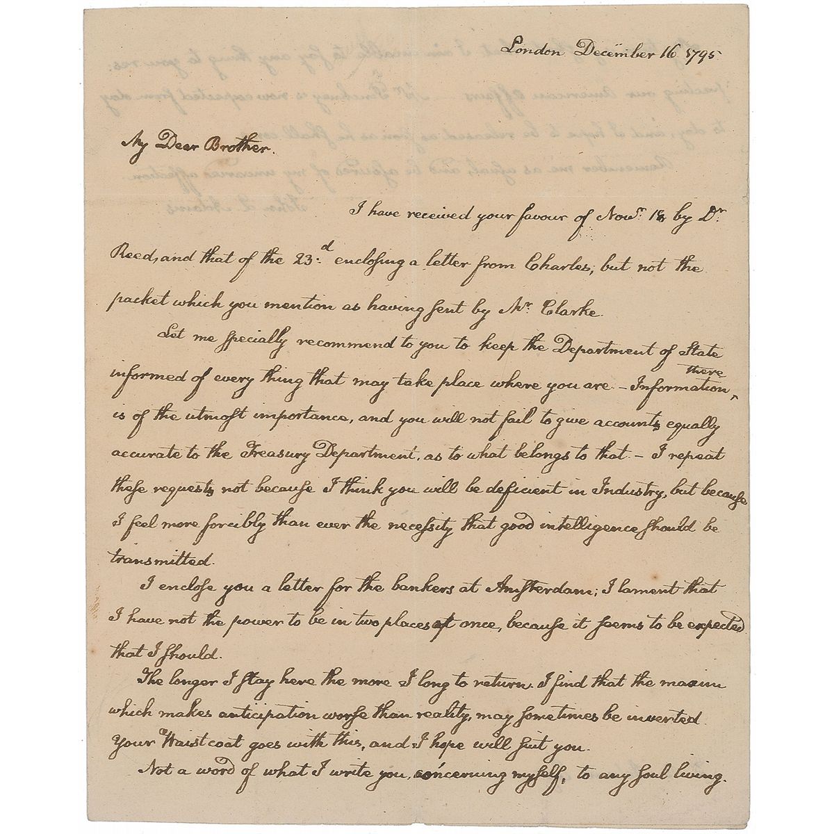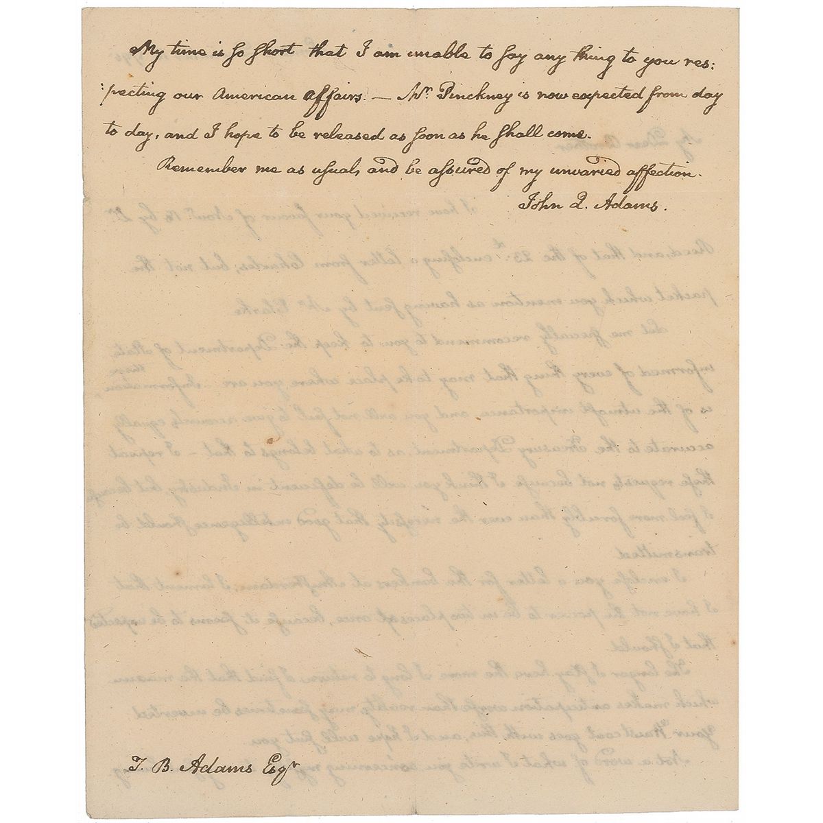 Early ALS signed “John Q. Adams,” one page both sides, 7.5 x 9.25, December 16, 1795. Letter to his brother, Thomas Boylston Adams. In part: “Let me specially recommend to you to keep the Department of State informed of every thing that may take place where you are. Information there is of the utmost importance, and you will not fail to give accounts equally accurate to the Treasury Department, as to what belongs to that. I repeat these requests, not because I think you will be deficient in industry, but because I feel more forcibly than ever the necessity that good intelligence should be transmitted. I enclose you a letter for the bankers at Amsterdam: I lament, that I have not the power to be in two places at once, because it seems to be expected that I should. The longer I stay here the more I long to return. I find that the maxim which makes anticipation worse than reality, may sometimes be inverted. Your waistcoat goes with this, and I hope will suit you. Not a word of what I write you, concerning myself, to any soul living. My time is so short that I am unable to say any thing to you respecting our American Affairs.” In fine condition, with intersecting folds (one vertical fold passing through a single letter of the signature). Although he is writing from London in this letter, at the time Adams was serving as minister to the Netherlands, a position to which he was appointed by George Washington; his brother accompanied him during most of his time in Europe, working as his secretary. A neatly penned and quite early letter from the future president.