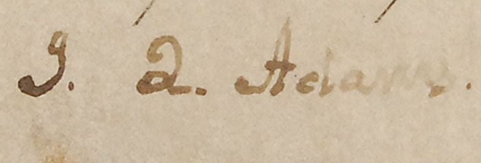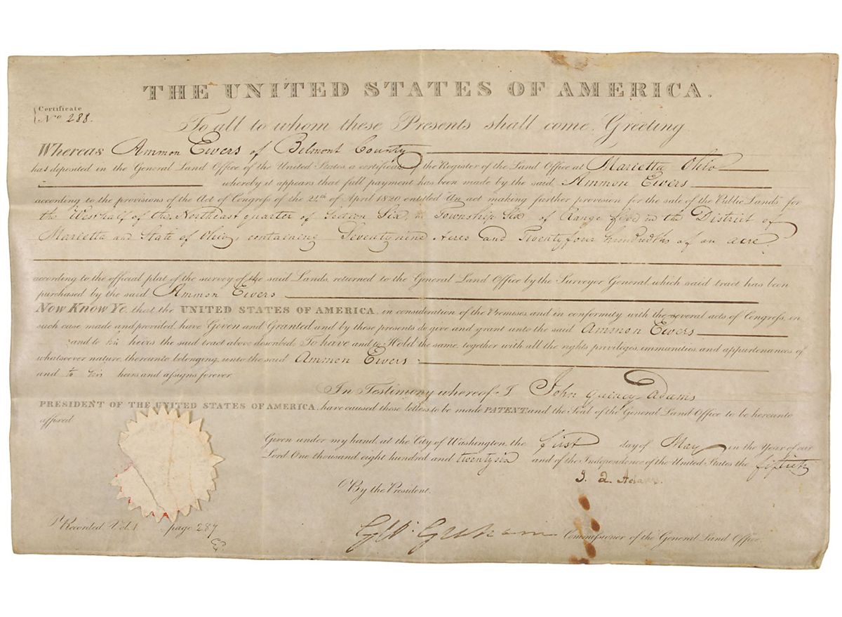 Partly-printed vellum DS, signed “J. Q. Adams,” one page, 16 x 10, May 1, 1826. President Adams grants Ammon Eivers of Belmont County a parcel of land in Marietta, Ohio, “containing Seventy nine Acres and Twenty four hundredths of an acre.” Signed at the conclusion by President Adams and countersigned by Commissioner of the General Land Office George Graham. The white paper seal remains affixed to the lower left with partial paper loss. In very good condition, with intersecting folds, scattered stains, and the last few letters of Adams’s signature quite faded.