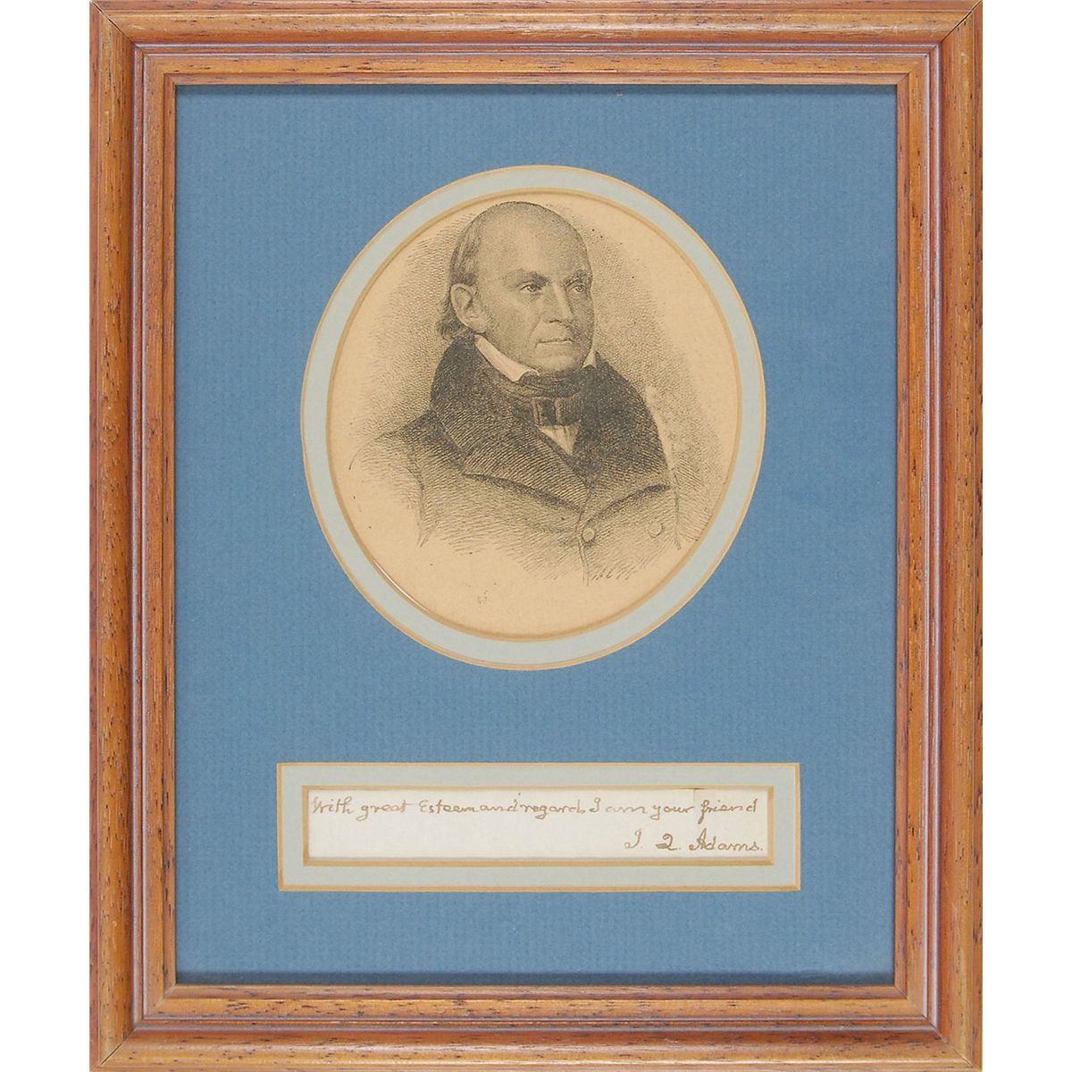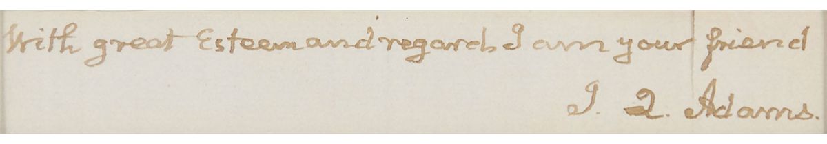 Ink signature, “With great esteem and regards I am your friend, J. Q. Adams,” on an off-white slip clipped from the closing of a letter. Double-matted and framed with a portrait of Adams to an overall size of 9 x 11. In fine condition, with several vertical folds, one through a single letter of signature, which is also slightly separated along the top edge, not affecting the signature.