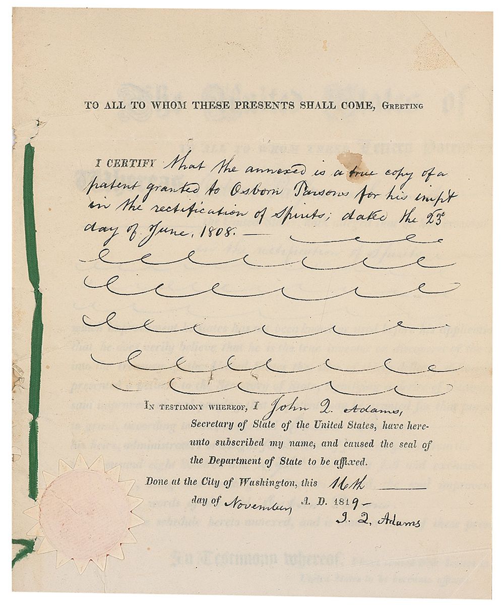 Partly-printed DS, signed “J. Q. Adams,” one page, 7.75 x 9.5, November 16, 1819. Adams, as secretary of state, certifies the accompanying documents are “a true copy of a patent granted to Osborn Parsons for his imp’t in the rectification of spirits.” Signed at the conclusion by Adams. The certification is bound with a green ribbon to the copy of the 1808 patent, completed and signed in a clerk’s hand on behalf of Thomas Jefferson and James Madison. A couple of small creases and tears, a small spot to text, and some scattered edge wear and paper loss to patent copy, otherwise fine condition. The white wafer seal is crisp and intact.