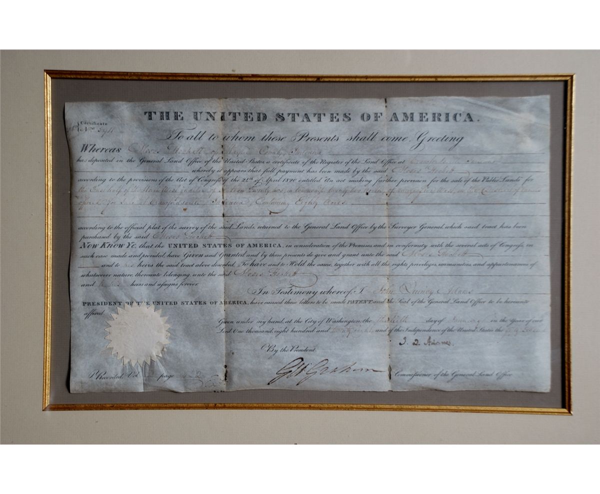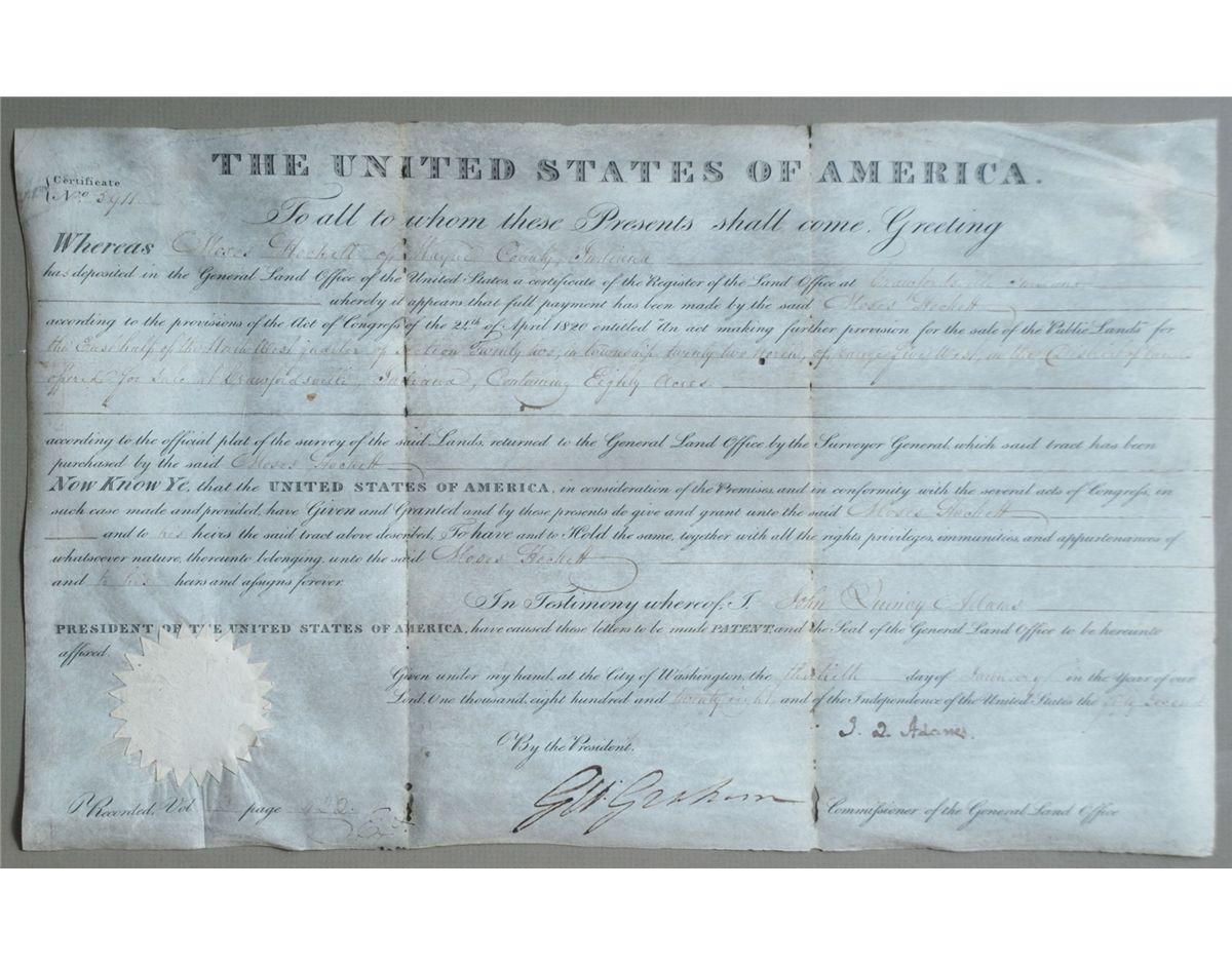 Sixth President of the United States from 1825 to 1829. Partly-printed vellum DS. Land Grant for a Moses Hockett of Wayne Country Indiana, dated January 13th, 1828. Moses Hockett, b 22 Oct 1770, He moved from North Carolina to Ohio, Tennessee, and finally Indiana. In Good Condition and has been loosely framed. Condition is good and signature is clear and darker than some of the other writing within the document.