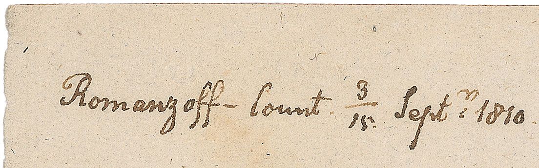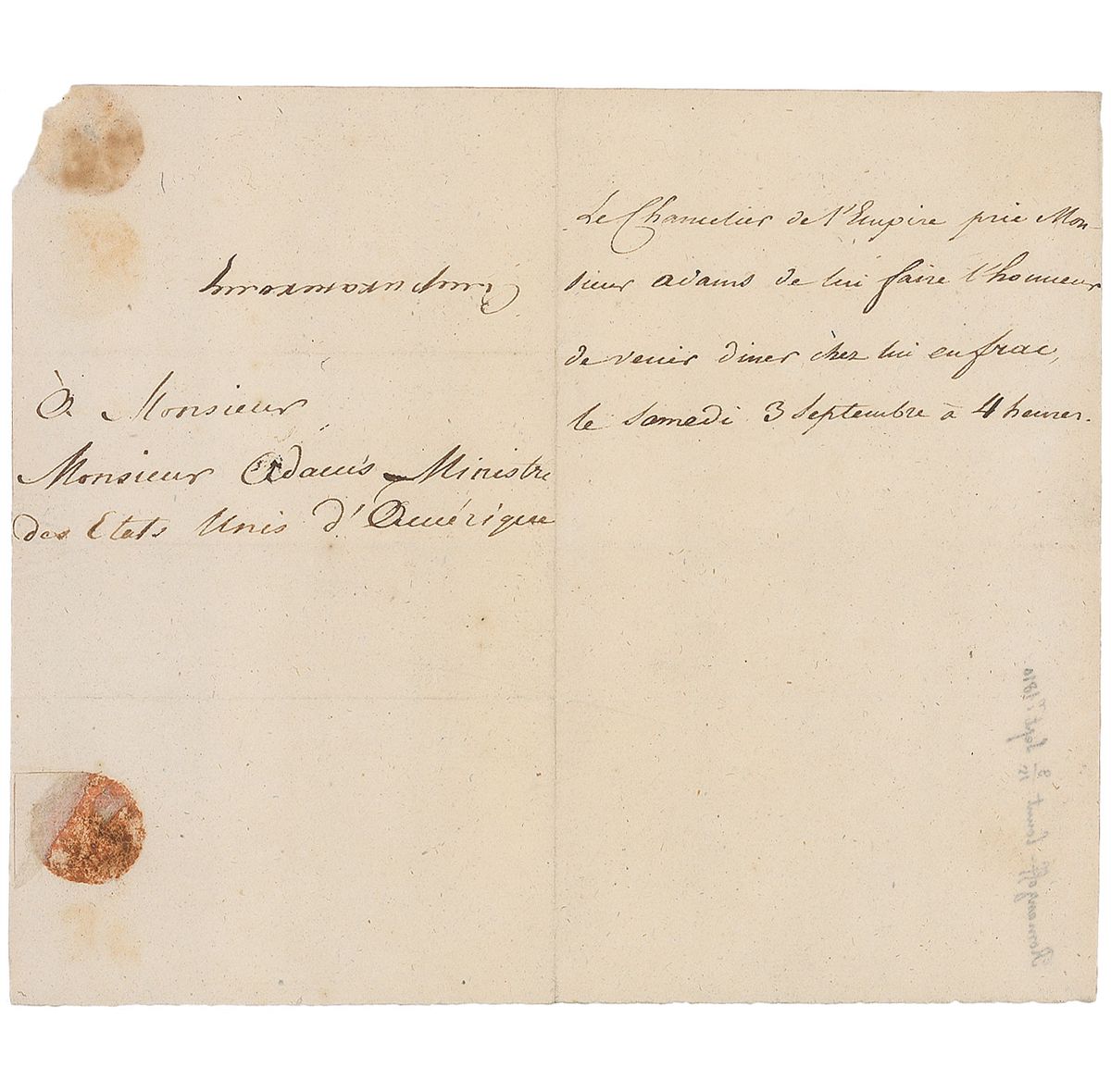 Unsigned docketing notation on the reverse of an invitation to Adams, 8.5 x 7.5, in French, from the Chancellor of Russia inviting Adams to dinner. Adams, serving as US Minister to Russia, dockets the reverse, “Romanzoff–Count 3/15 Septr. 1810.” In fine condition, with wax seal remnants to left edge, one missing corner tip, and horizontal folds.