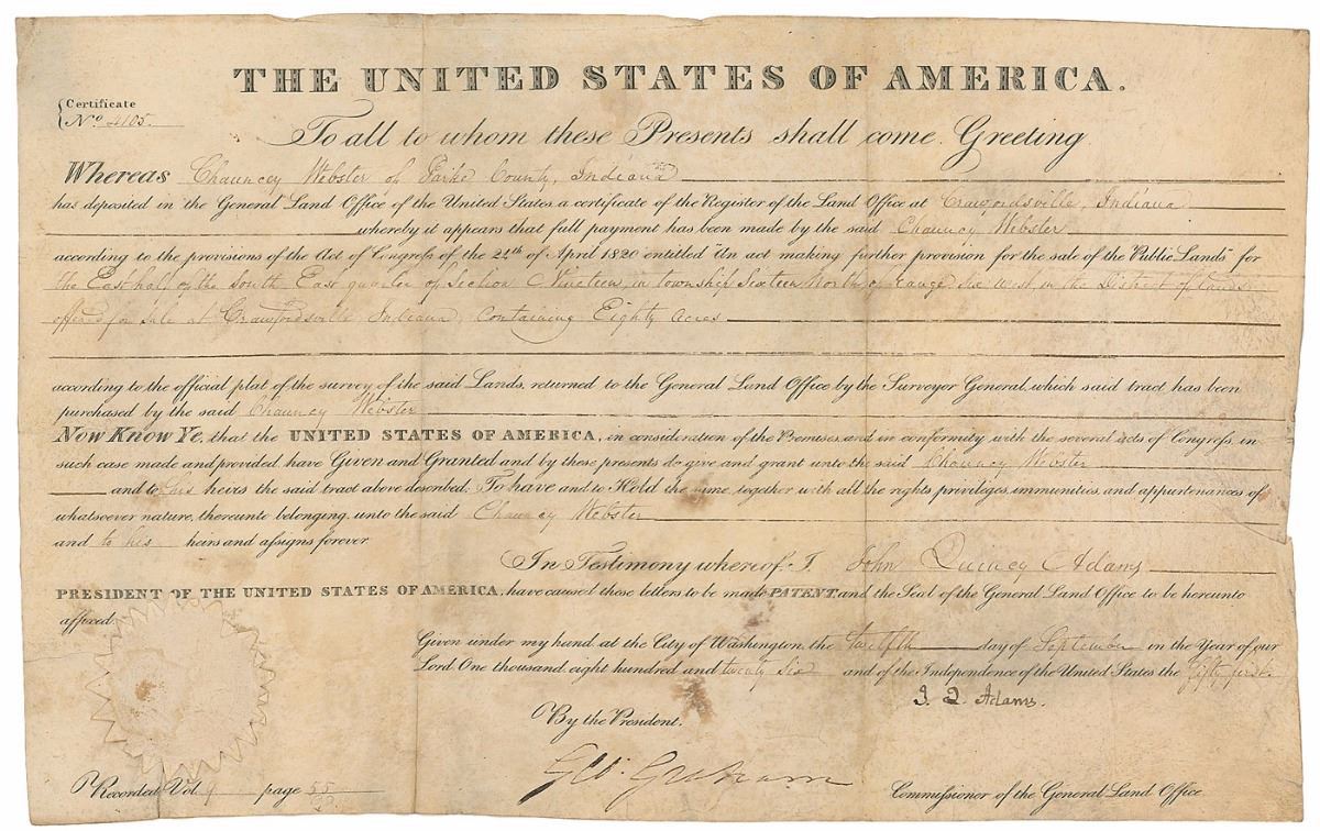 Partly-printed vellum DS as president, signed “J. Q. Adams,” one page, 15.5 x 9.5, September 12, 1826. President Adams grants Chauncey Webster a parcel of land in “Crawfordsville, Indiana, containing Eighty acres.” Boldly signed at the conclusion by President Adams and countersigned by Commissioner of the General Land Office George Graham. The white paper seal affixed to the lower left remains intact. In very good condition, with intersecting folds, overall creases, and scattered soiling.