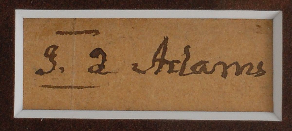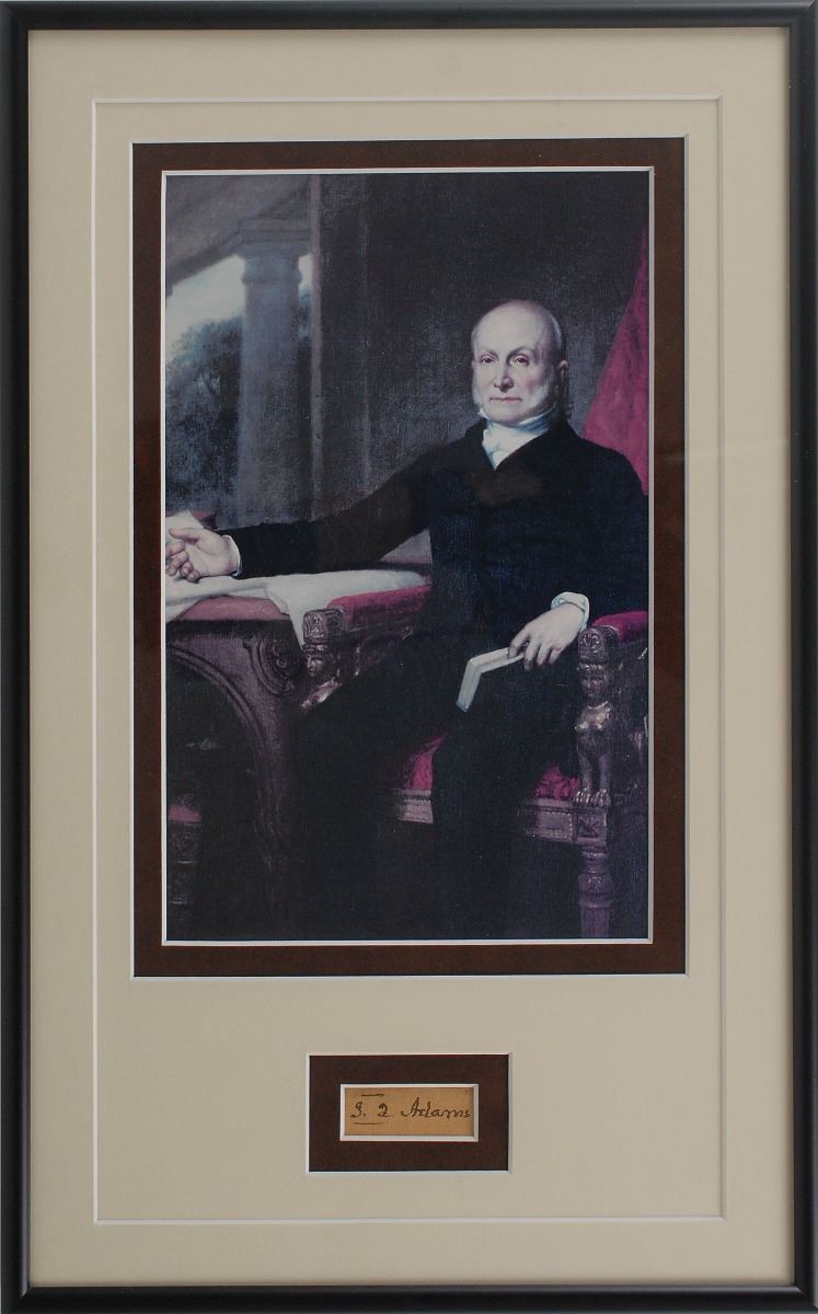 Ink signature, “J. Q. Adams,” on an off-white 1.5 x .5 slip. Triple-matted and framed with a color portrait of Adams to an overall size of 10.25 x 16.25. In fine condition, with a crease bisecting the two initials.