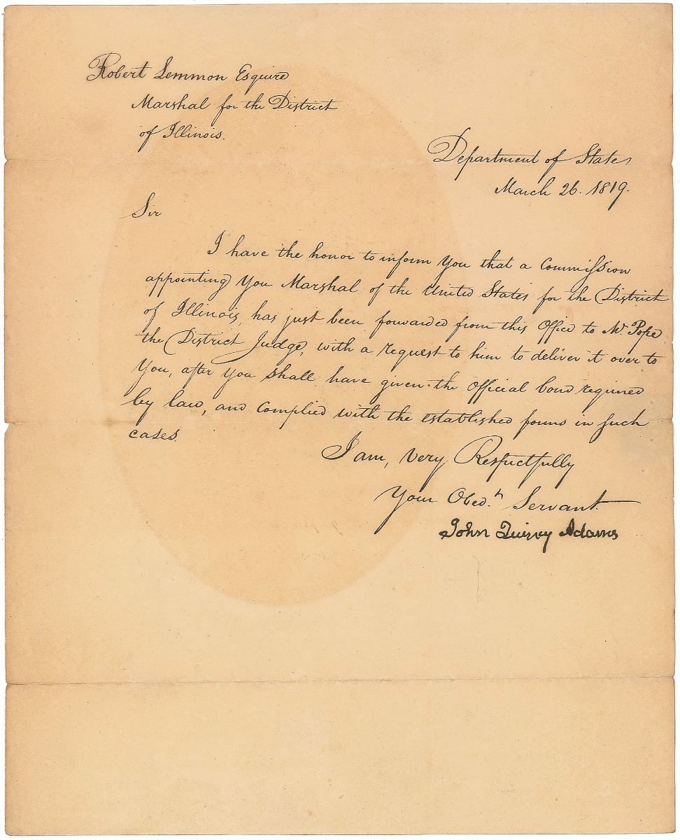 LS, one page, 8 x 9.75, March 26, 1819. Letter to Robert Lemmon, the Marshal for the district of Illinois, in full: “I have the honor to inform you that a Commission appointing you Marshal of the United States for the District of Illinois has just been forwarded from this Office to Mr. Pope the District Judge, with a request to him to deliver it over to you, after you shall have given the official bond required by law, and complied with the established forms in such cases.” In fine condition.