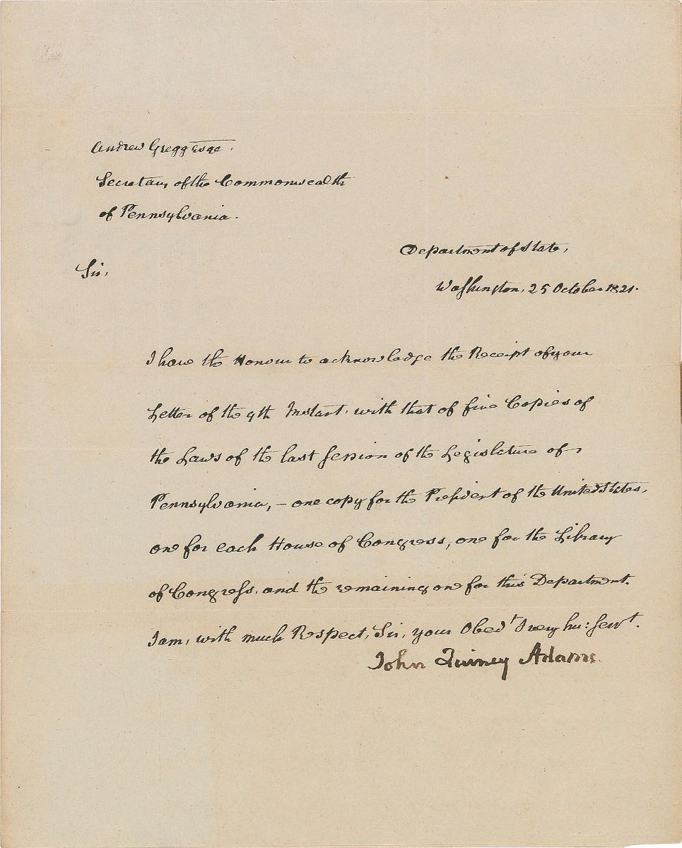 LS, one page, 8 x 10, October 25, 1821. Letter to Andrew Gregg, secretary of the Commonwealth of Pennsylvania. In part: “I have the Honour to acknowledge the Receipt of…five Copies of the Laws of the last Session of the Legislature of Pennsylvania,—one copy for the President of the United States, one for each House of Congress, one for the Library of Congress, and the remaining one for this Department.” In fine condition. Accompanied by a full letter of authenticity from JSA.