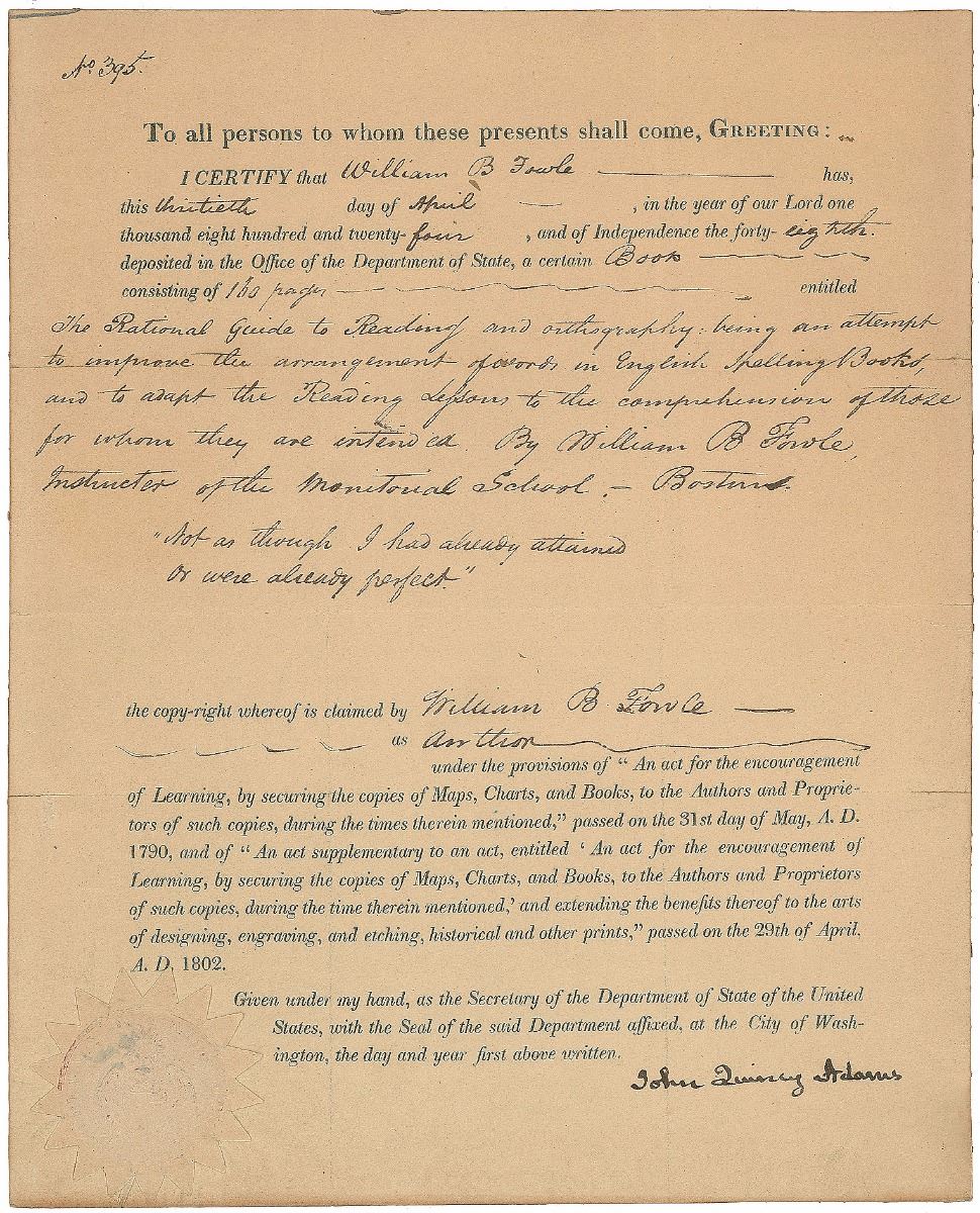 Partly-printed DS, one page, 8 x 9.75, April 30, 1824. Official copyright document, in part: “I certify that William B. Fowle has…deposited in the Office of the Department of State, a certain Book consisting of 160 pages, entitled The Rational Guide to Reading and orthography: being an attempt to improve the arrangement of words in English Spelling Books, and to adapt the Reading Lessons to the comprehension of those for whom they are intended, By William B. Fowle, Instructor of the Monitorial School.—Boston.” Boldly signed at the conclusion in full as secretary of state. The white paper seal affixed to the lower left remains fully intact. Mounted to a same-size board. In fine condition.