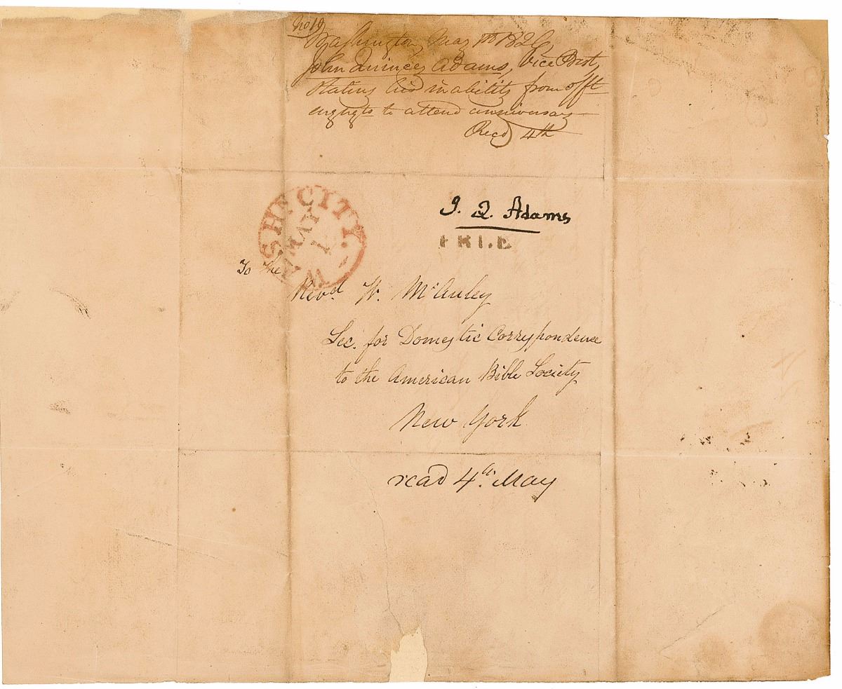 Full free frank, 9.75 x 8, with franked panel measuring 5 x 3.25, addressed in another hand to “The Revd W. McAuley, Sec. for Domestic Correspondence to the American Bible Society, New York,” boldly franked at the upper right, “J. Q. Adams,” and stamped below, “Free.” Sheet has been professionally reinforced, with a strip applied to reverse top edge. Docketing to top and bottom panels, vertical fold through left side of panel, and some scattered light toning and soiling to edges, most of which could be matted out, otherwise fine condition.