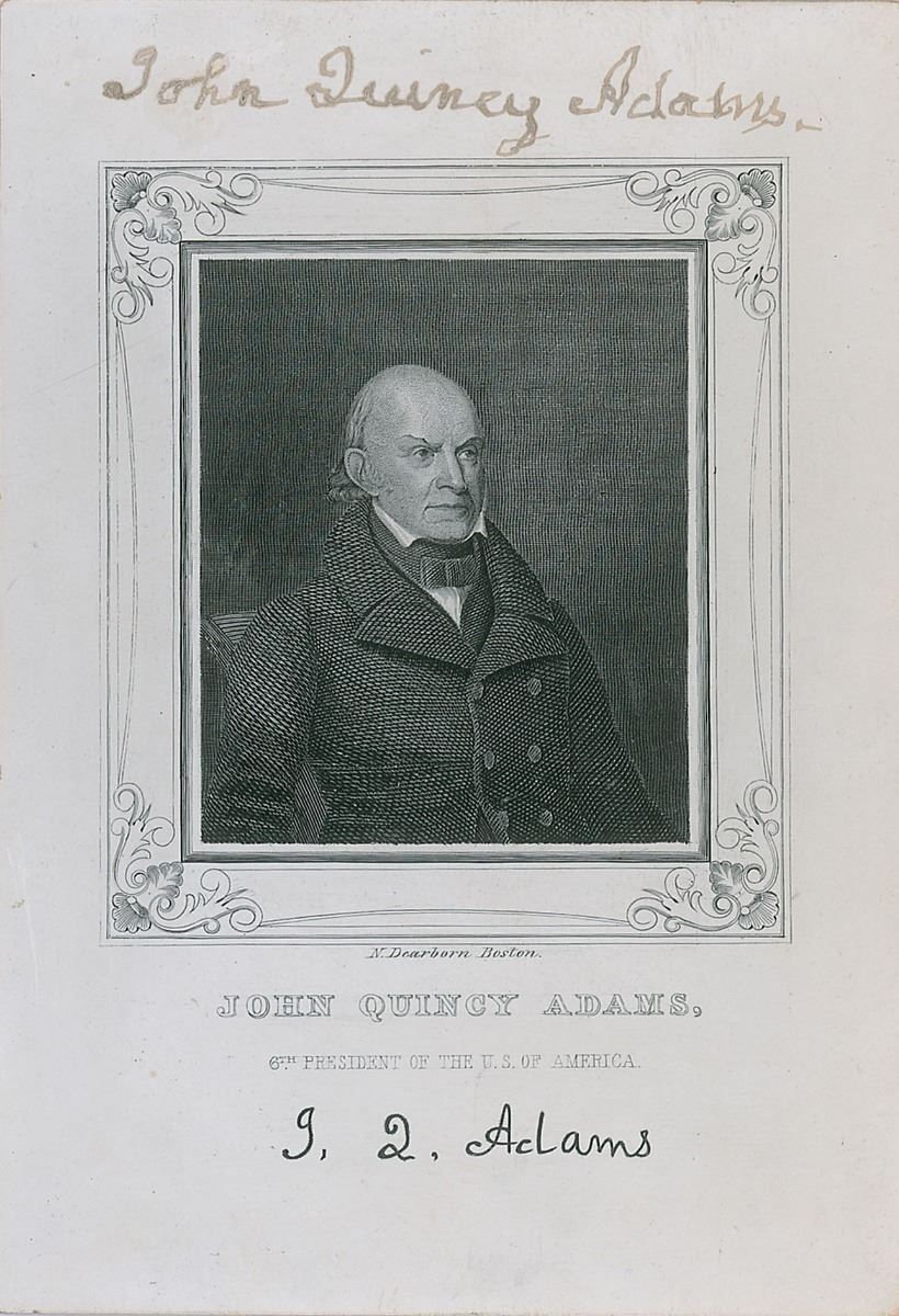 Exceedingly rare 3.25 x 4.75 engraved portrait of Adams by Nathaniel Dearborn, signed across the top in black ink using his full name, “John Quincy Adams.” In fine condition, with some trivial surface scuffing near his first name. Adams is known to have ordered some of his portraits from Dearborn—a fellow Bostonian—around 1842, and other signed examples of this engraving are known but hardly ever appear. These are the earliest known signed images of any president and thus hold substantial historical value.