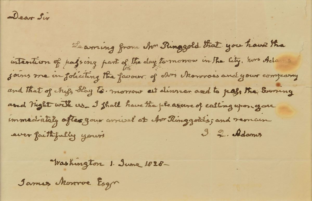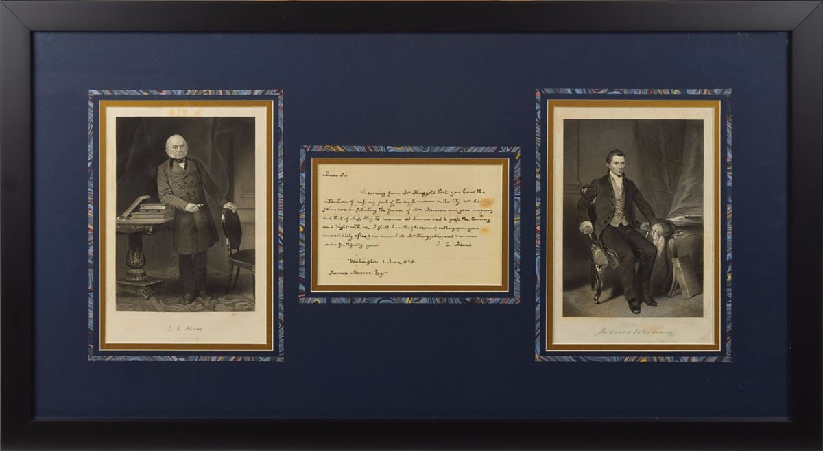 ALS as president signed “J. Q. Adams,” one page, 6.75 x 4.5, June 1, 1828. Letter to "James Monroe Esq'r," in full: "Learning from Mr. Ringgold that you had the intention of passing part of the day tomorrow in the City, Mrs. Adams joins me in soliciting the favour of Mrs. Monroe's and your company and that of Miss Hay tomorrow at dinner to pass the evening and night with us. I shall have the pleasure of calling upon you immediately after your arrival at Mr. Ringgold's." Handsomely double-matted and framed with engravings of both presidents (both bearing printed signatures) to an overall size of 31 x 17. In very good to fine condition, with two short edge tears and a few stains near the right edge. Tench Ringgold was a close friend of Monroe's and served as US marshal for the District of Columbia from 1818 through 1831. In 1825 he built a stately brick residence on land purchased from Tobias Lear, where often hosted distinguished guests including Monroe and Supreme Court Justices John Marshall and Joseph Story. The "Miss Hay" mentioned in this letter was most likely Hortensia Hay, granddaughter of the Monroes. Presidential autograph letters by Adams are quite scarce, and the exquisite associative content of this example makes it truly spectacular.