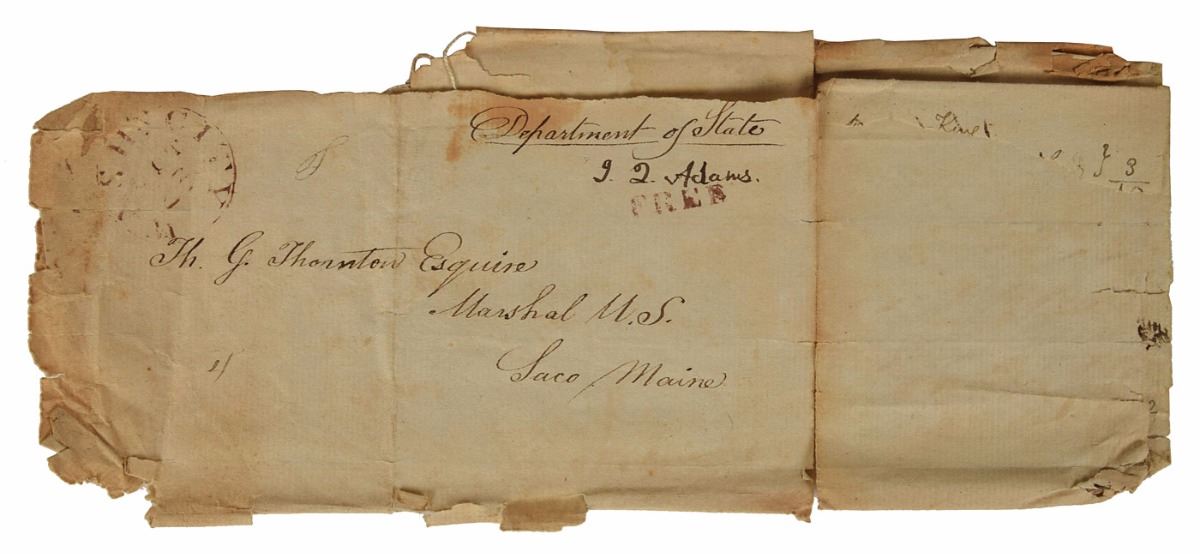 Free franked mailing cover with the address panel measuring 6.25 x 3.5, addressed in another hand to "Th. G. Thornton Esquire, Marshal U.S., Saco, Maine," and franked in the upper right by Adams as secretary of state, "J. Q. Adams." Folded panels of the cover remain partially intact. In very good condition, with a light stain to the top, light toning, and rough edges.