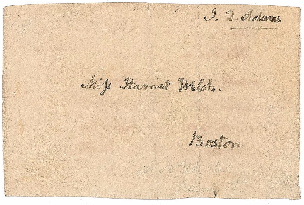 Free-franked address panel accomplished in Adams's hand, 4.75 x 3, addressed to "Miss Harriet Welsh, Boston,” and franked in the upper right, “J. Q. Adams.” In fine condition, with trimmed edges and light creasing.
