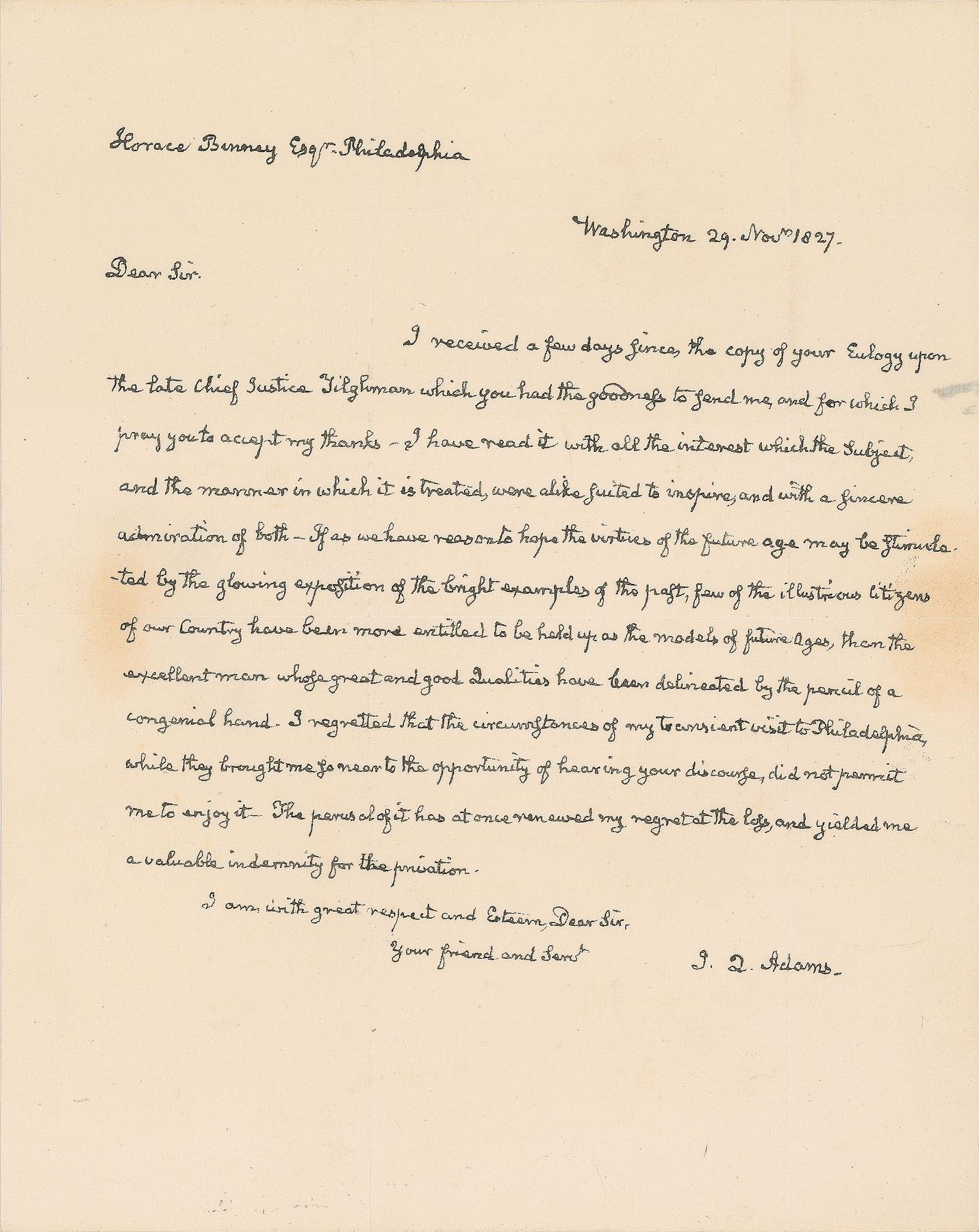 ALS as president signed “J. Q. Adams,” one page, 7.75 x 10, November 29, 1827. Beautifully penned letter to prominent Philadelphia lawyer Horace Binney, in part: "I received a few days since the copy of your Eulogy upon the late Chief Justice Tilghman which you had the goodness to send me, and for which I pray you to accept my thanks. I have read it with all the interest which the subject and the manner in which it is treated, were alike suited to inspire, and with a sincere admiration of both. If as we have reason to hope the virtues of the future age may be stimulated by the glowing exposition of the bright examples of the past, few of the illustrious citizens of our country have been more entitled to be held up as the models of future ages, than the excellent man whose great and good qualities have been delineated by the peril of a congenial hand. I regretted that the circumstances of my transient visit to Philadelphia, while they brought me so near to the opportunity of hearing your discourse, did not permit me to enjoy it. The perusal of it has at once renewed my regret at the loss, and yielded me a valuable indemnity for the privation." In fine condition.