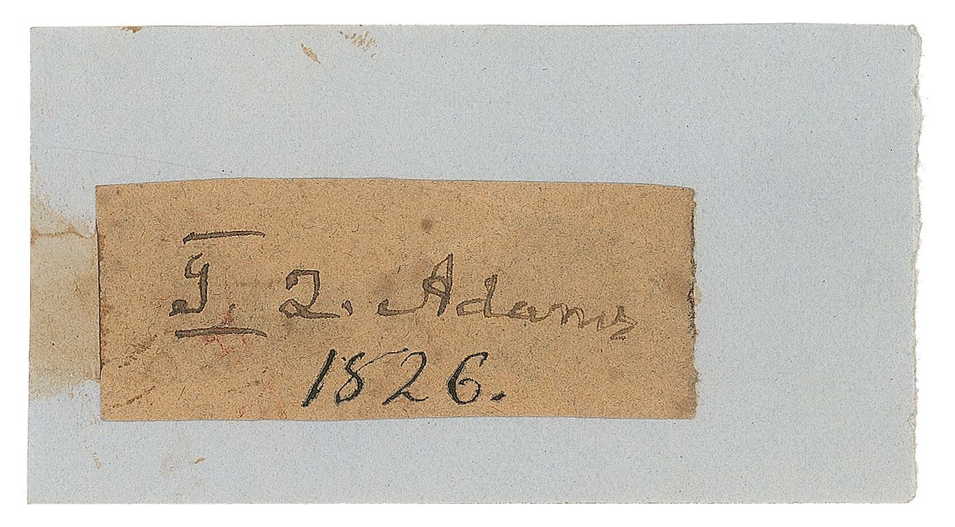 Ink signature, "J. Q. Adams,” on an off-white 1.75 x .75 slip, dated "1826" in another hand. Affixed to a slightly larger slip and in very good to fine condition, with light overall soiling.