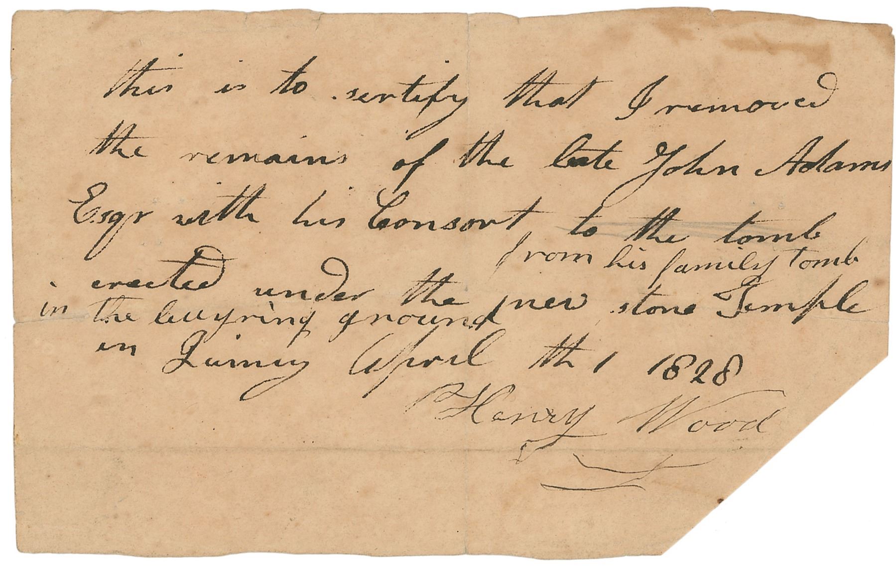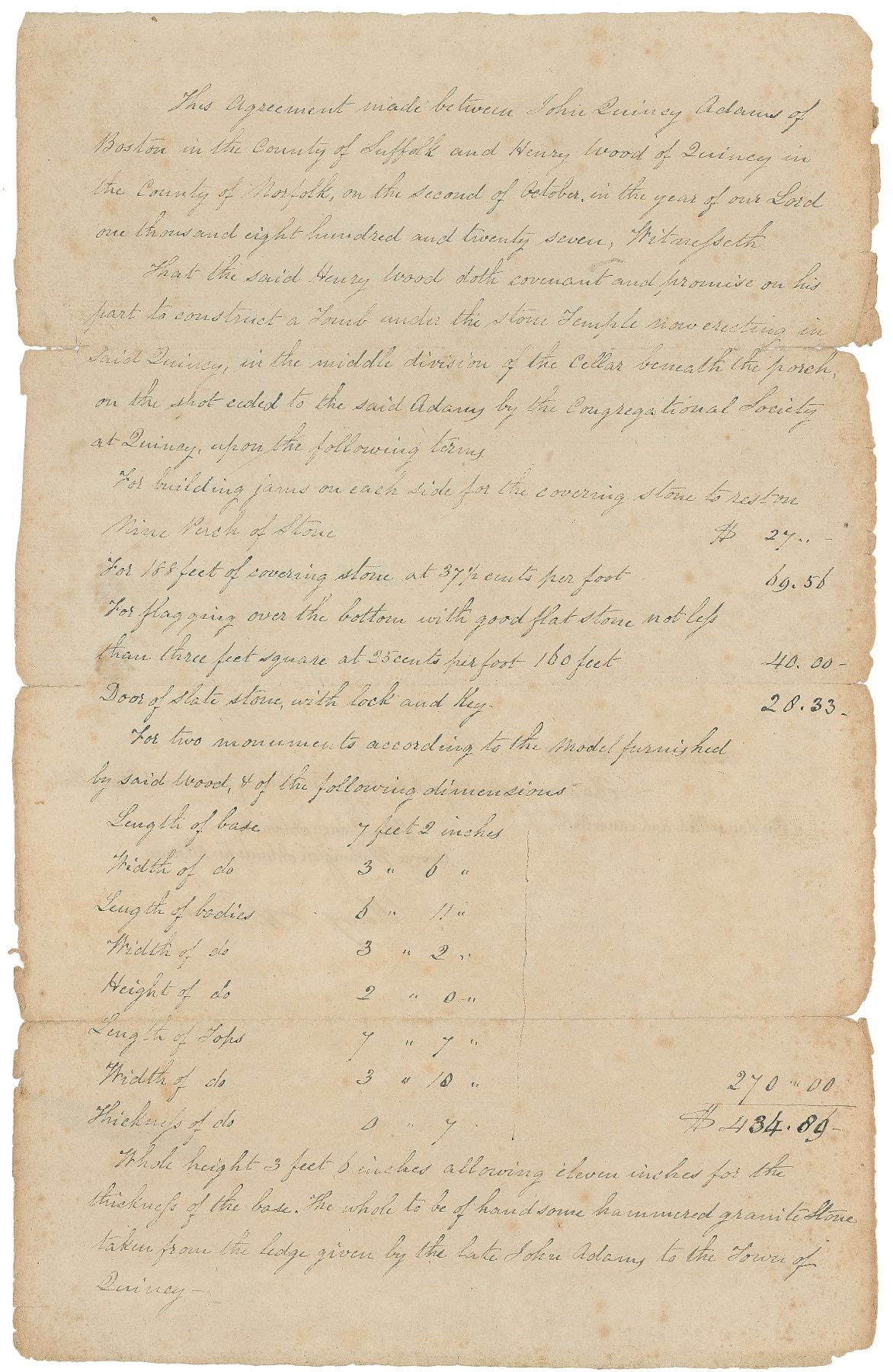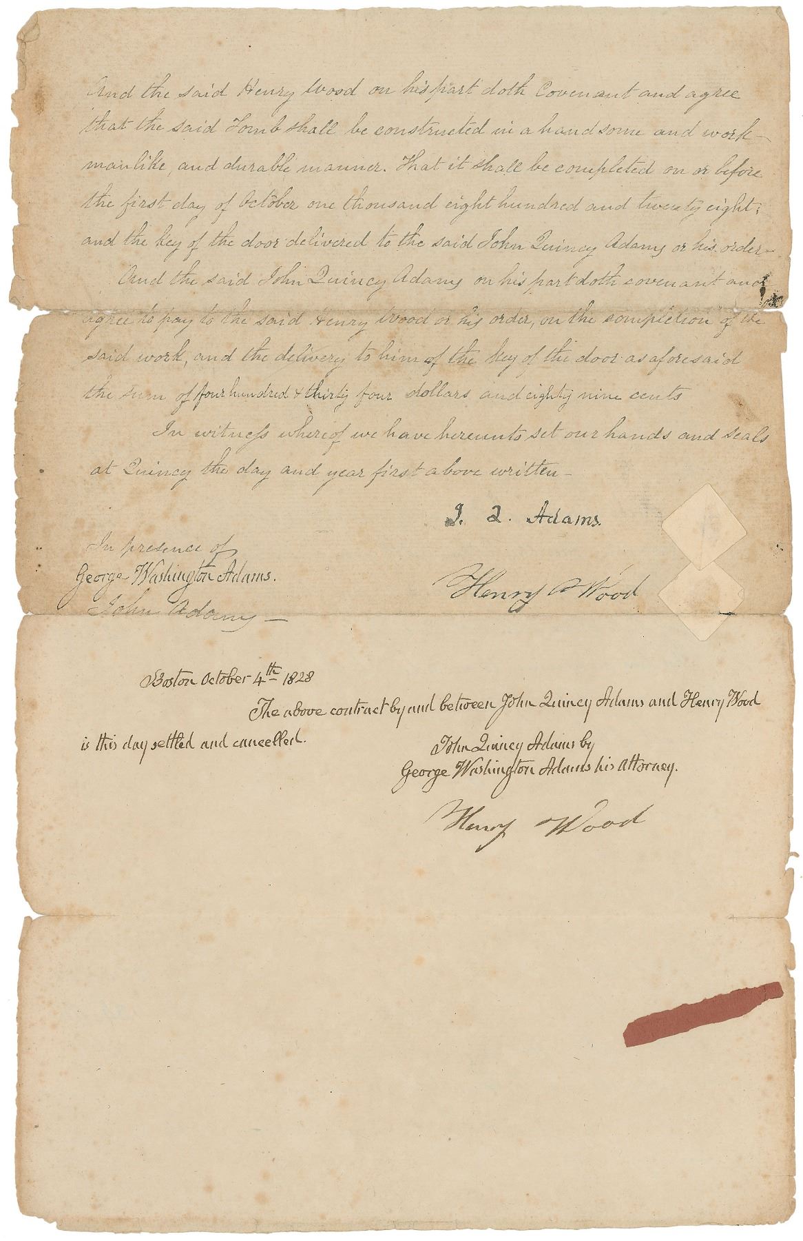 Manuscript DS, signed "J. Q. Adams," one page both sides, 8.5 x 13, October 2, 1827. Contract for the construction of the family crypt. In part: "This agreement made between John Quincy Adams of Boston in the County of Suffolk and Henry Wood of Quincy…That the said Henry Wood doth covenant and promise on his part to construct a tomb under the stone temple now erecting in said Quincy, in the middle division of the cellar beneath the porch, on the spot ceded to the said Adams by the Congregational Society at Quincy…The whole to be of handsome hammered granite stone taken from the ledge given by the late John Adams to the Town of Quincy. And the said Henry Wood on his past doth covenant and agree that the said tomb shall be constructed in a handsome and workmanlike and durable manner…And the said John Quincy Adams on his part doth covenant and agree to pay to the said Henry Wood or his order, on the completion of the said work, and the delivery to him of the key of the door…the sum of four hundred & thirty four dollars and eighty nine cents." Signed at the conclusion once by John Quincy Adams and twice by Henry Wood, and countersigned by John Quincy Adams's sons George Washington Adams and John Adams II as witnesses. Also includes a manuscript receipt signed by Wood, in full: "This is to certify that I removed the remains of the late John Adams Esqr. with his Consort from his family tomb in the burying ground to the tomb erected under the new stone Temple in Quincy April the 1, 1828." In very good condition, with fragile intersecting folds with partial edge separations, and scattered light foxing.