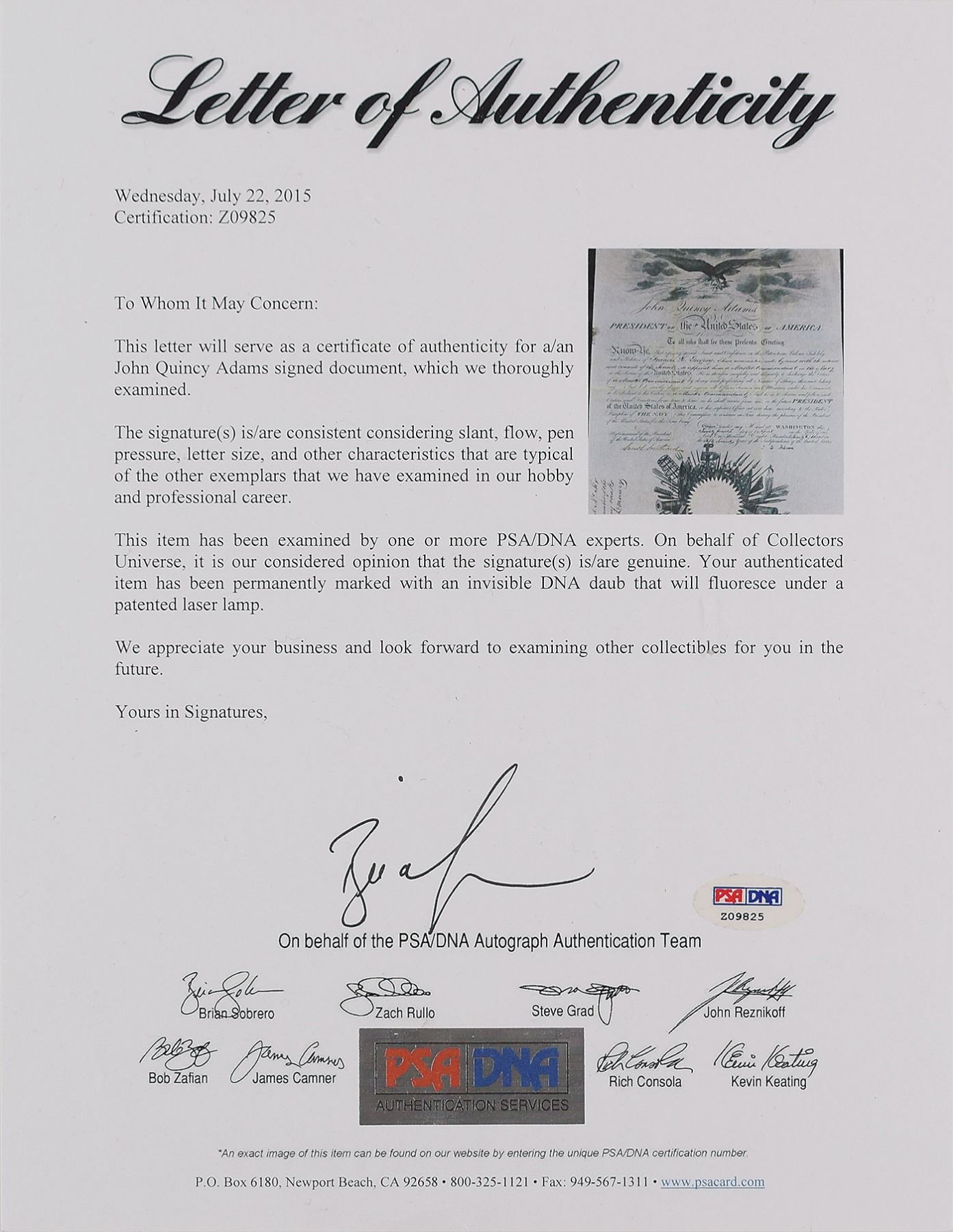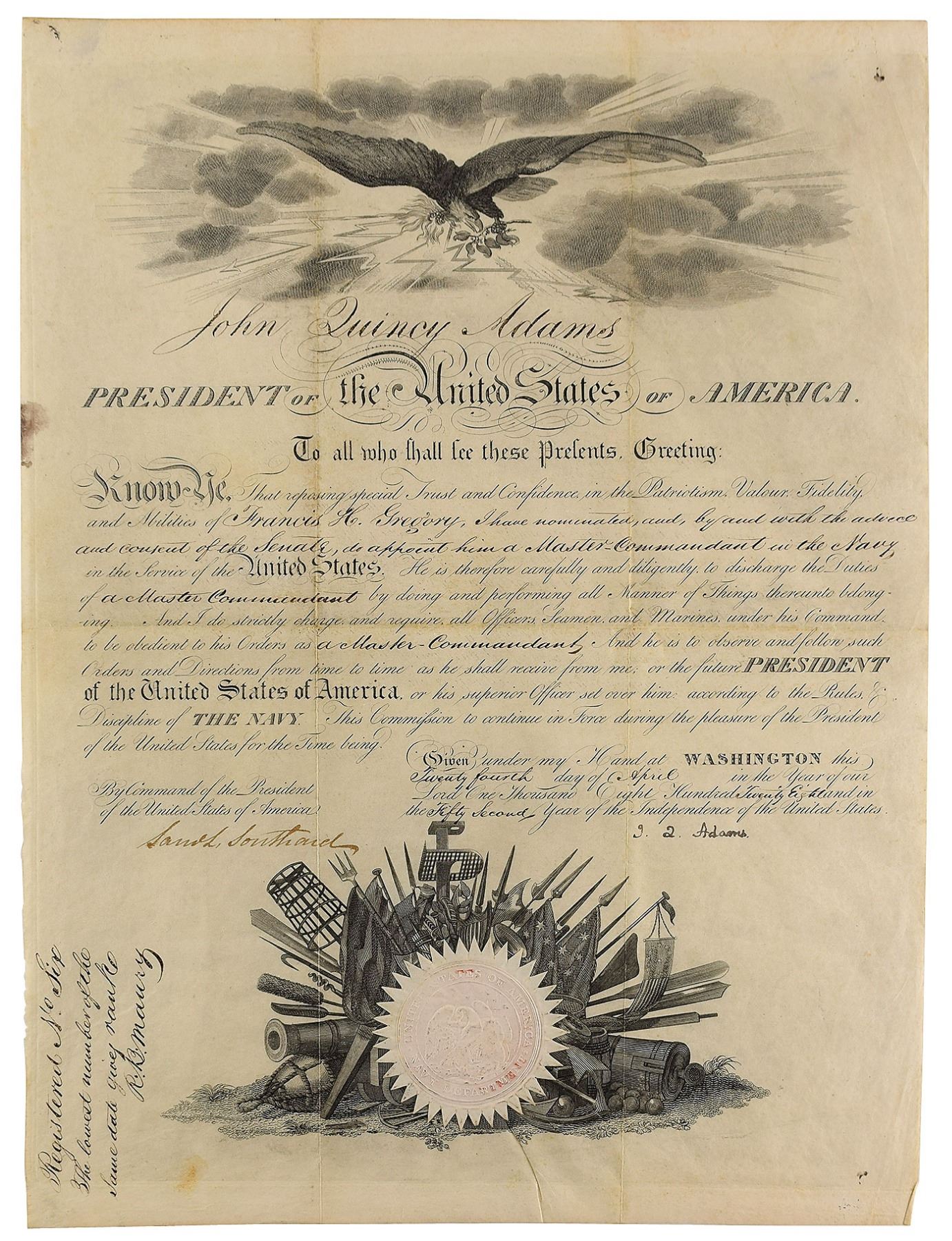 Partly-printed vellum DS as president, signed "J. Q. Adams," one page, 14 x 18.5, April 24, 1828. President Adams appoints Francis H. Gregory as "a Master Commandant in the Navy in the Service of the United States." Boldly signed at the conclusion by Adams and countersigned by Secretary of the Navy Samuel L. Southard. The crisply embossed white paper seal affixed at the bottom remains fully intact. In fine condition, with a few small stains in blank areas. Accompanied by a full letter of authenticity from PSA/DNA.
