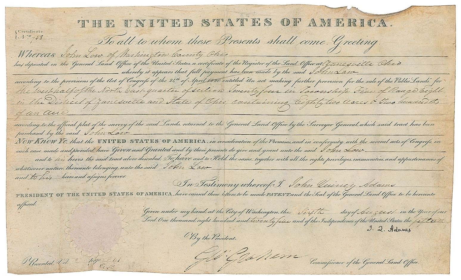 Partly-printed vellum DS as president, signed “J. Q. Adams,” one page, 15.25 x 9.25, August 6, 1825. President Adams grants John Low a parcel of land "in the District of Zanesville and State of Ohio containing Eighty two acres & Two hundredths of an acre." Signed boldly at the conclusion by President Adams and countersigned by Commissioner of the General Land Office George Graham. The white paper seal affixed to the lower left remains intact. In fine, folded condition.