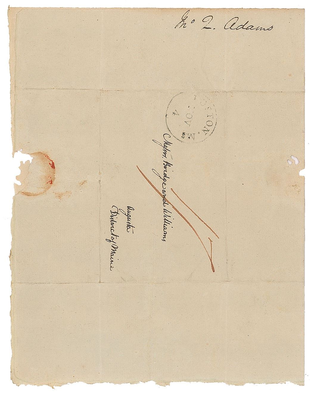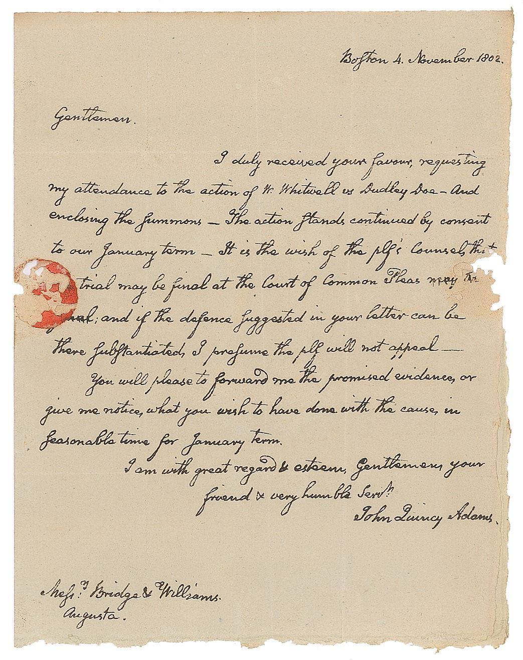 ALS, one page, 6.5 x 8.25, November 4, 1802. Written from Boston, a letter to law partners James Bridge and Keuel Williams of Augusta, Maine, in part: "I duly received your favour, requesting my attendance to the action of W. Whitewell vs Dudley Doe—And enclosing the summons—the action stands continued by consent to our January term. It is the wish of the plf's counsels that…trial may be final at the Court of Common Pleas may…; and if the defence suggested in your letter can be there substantiated, I presume the plf will not appeal. You will please to forward me the promised evidence, or give me notice, what you wish to have done with the cause, in seasonable time for January term. I am with great regard & esteem gentlemen your friend & very humble serv't." In very good to fine condition, with several areas of seal-related paper loss affecting a few words of text. A decidedly early letter from the future sixth president—Adams was elected to the Massachusetts Senate in April 1802, assuming his official seat the succeeding year on March 4, 1803—with this desirable, cleanly penned example boasting an uncommon full signature.