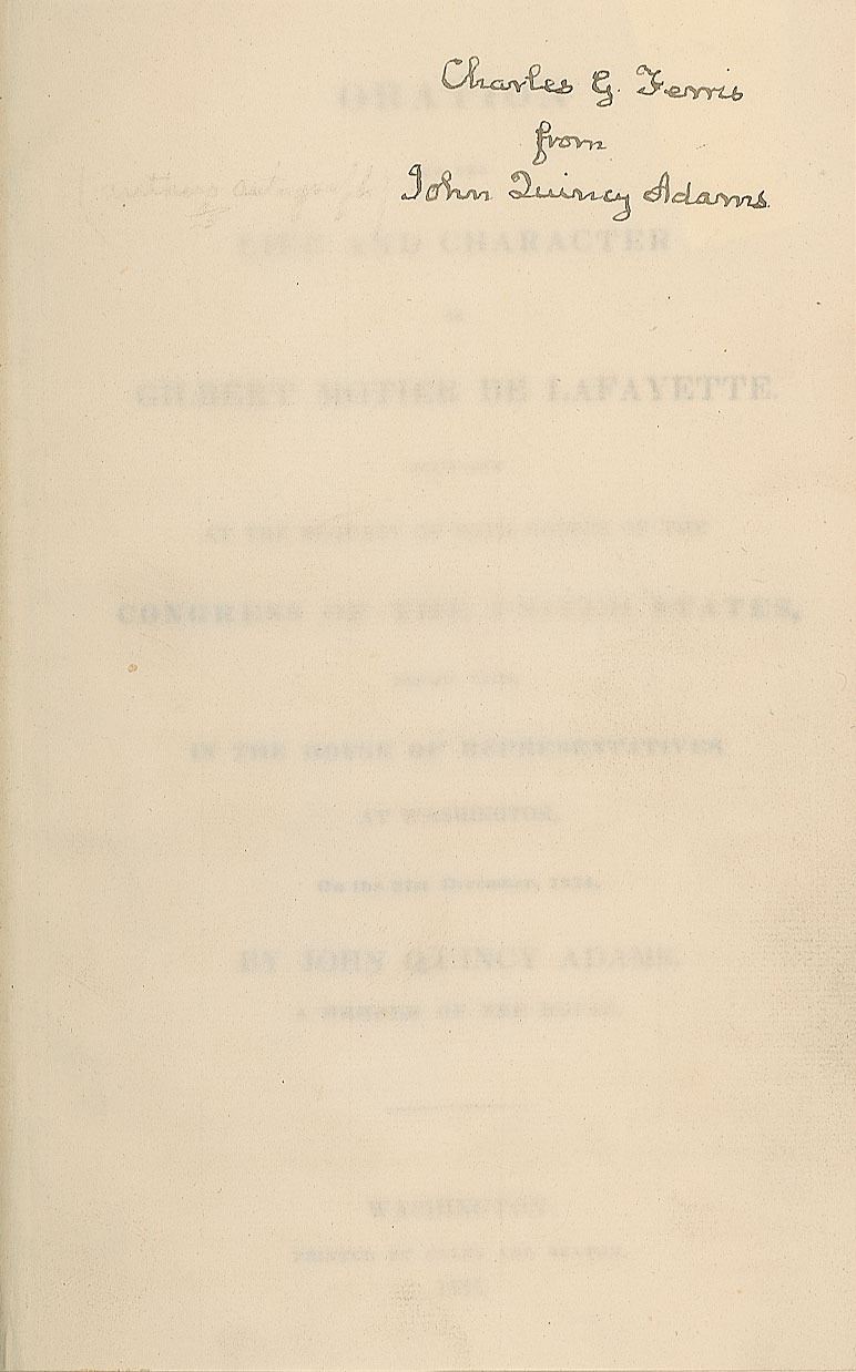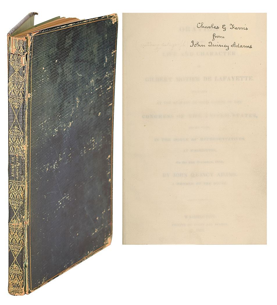 Signed book: Oration on the life and character of Gilbert Motier de Lafayette, Delivered at the request of both houses of the Congress of the United States, before them, in the House of Representatives at Washington, on the 31st December, 1834. Washington: Gales and Seaton, 1835. Hardcover bound in dark green morocco with gilt spine decoration, 5.5 x 8.75, 94 pages. Signed and inscribed on a sheet tipped to the title page in ink, "Charles G. Ferris, from John Quincy Adams." Autographic condition: fine. Book condition: VG-/None, with scuffing and rubbing to boards and spine, losses to head of spine, bumped corners, and a "Library of Lawrence E. Miller" blindstamp to a rear page.