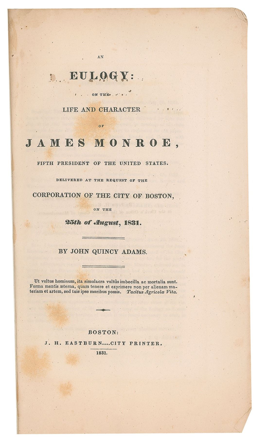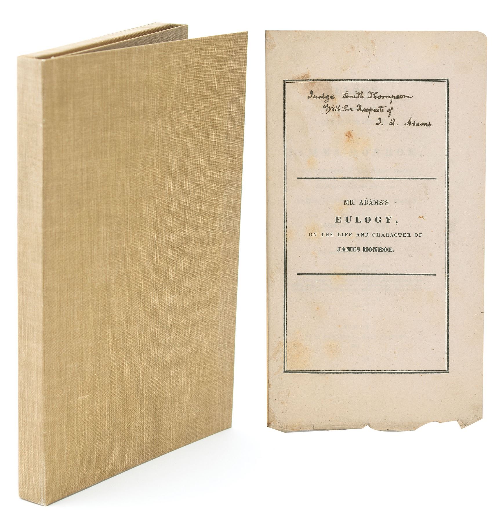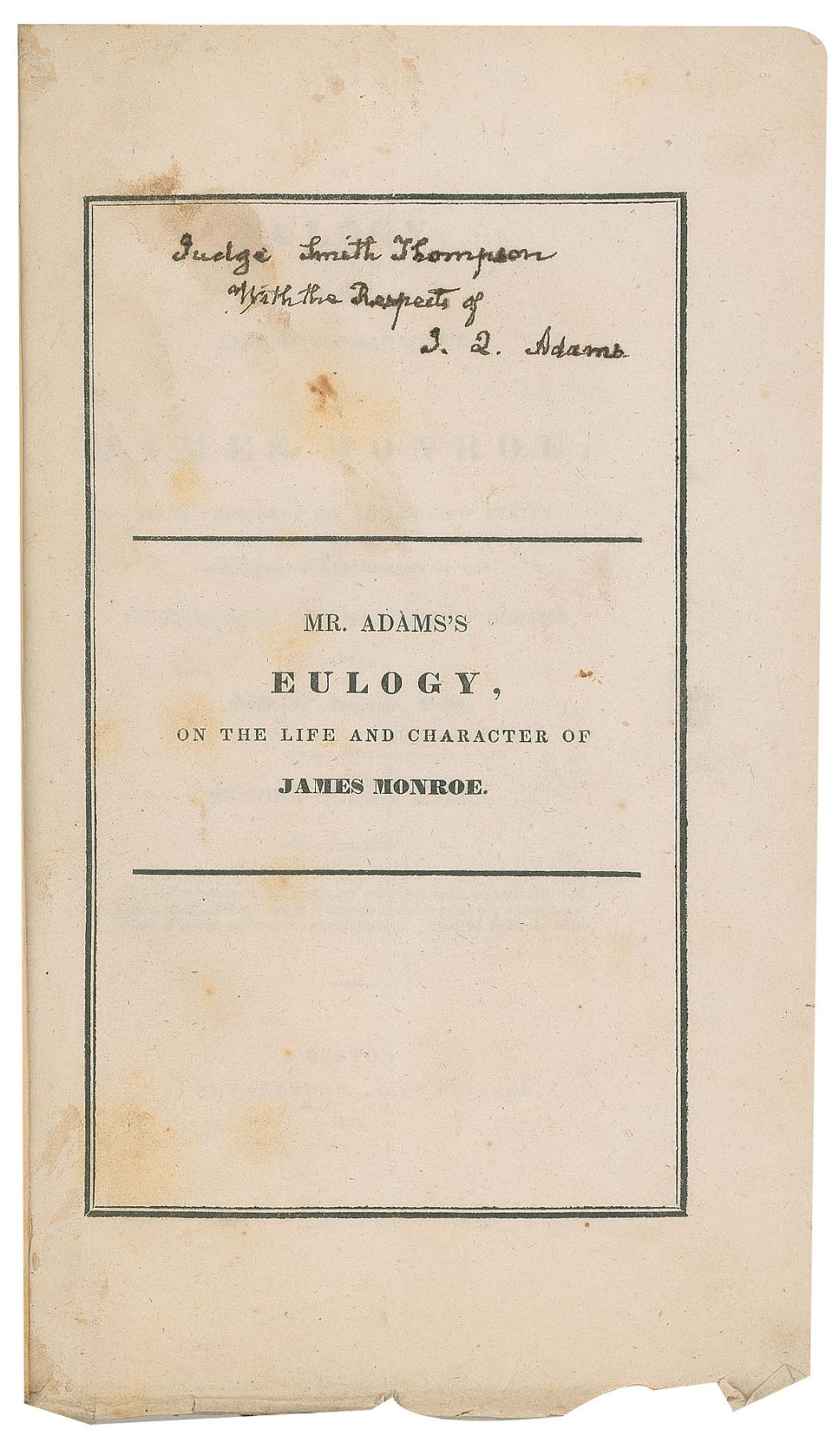 Signed booklet: An Eulogy on the Life and Character of James Monroe, fifth president of the United States, delivered at the request of the Corporation of the City of Boston on the 25th of August, 1831. Boston: J. H. Eastburn, 1831. Booklet bound in cream paper wrappers, 6.25 x 9.75, 100 pages. Signed and inscribed on the half-title page in ink, "Judge Smith Thompson, With the Respects of J. Q. Adams." Autographic condition: very good to fine, with scattered light staining and a central vertical fold to the signed page. Book condition: VG-/None, with scattered creasing and mottled foxing throughout. Accompanied by a modern cloth presentation folder.