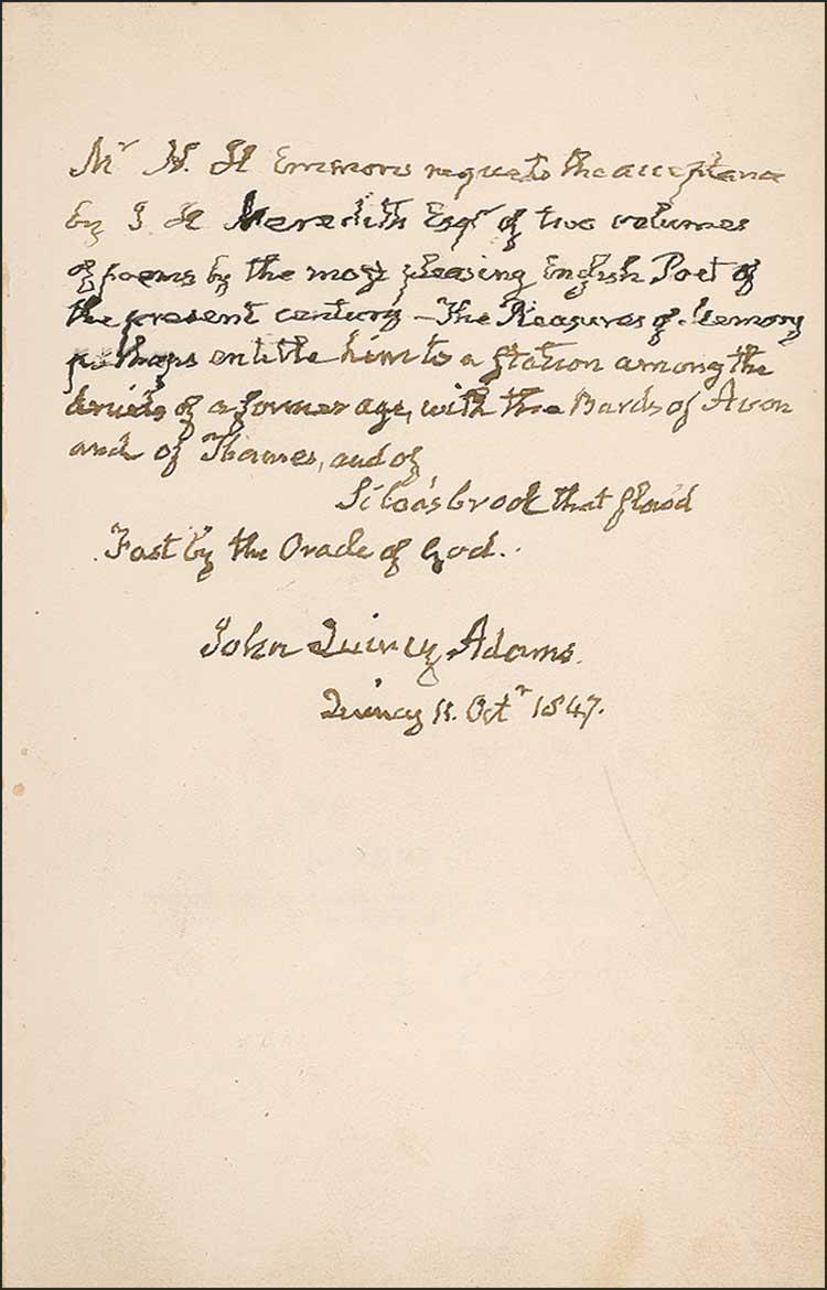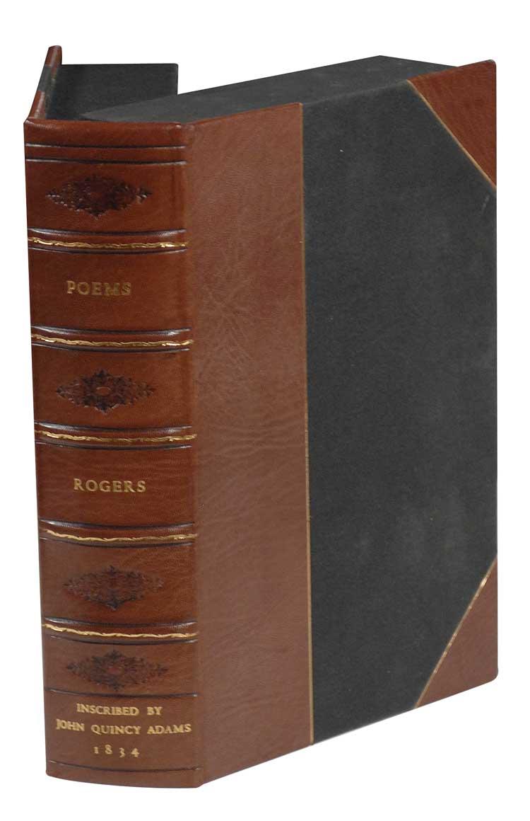 Signed book: Poems by Samuel Rogers. London: , 1834. Hardcover, 5.25 x 8, 295 pages. The lengthy 60 word signed inscription by Adams on a neatly inserted presentation page opposite the frontispiece engraving of Samuel Rogers reads, in full: “Mr. H.H. Emmons requests the acceptance by J H Meredith Esqr of two volumes of poems by the most pleasing English Poet of the present century – The Pleasures of Memory perhaps entitle him to a station among the druids of a former age, with the Bards of Avon and of Thames, and of Siloa’s brook that flow’d Fast by the Oracle of God. John Quincy Adams, Quincy 11. Octr 1847.” Book is housed in an attractive custom black, half brown leather, clamshell box with gilt spine titles. In very good condition, with considerable rubbing at edges of spine and covers, scattered foxing inside, detached front cover and opening pages, and spine a bit fragile.