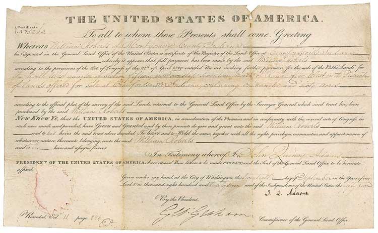 Partly-printed DS as president, signed “J. Q. Adams,” one page, 15.5 x 9.5, September 20, 1827. President Adams signs a land grant for 160 acres to William Roberts in Indiana. Signed at the conclusion by Adams, and countersigned by Commissioner of the General Land Office George Graham. Accompanied by a full letter of authenticity from PSA/DNA. In very good condition, with some scattered light paper loss along intersecting storage folds, scattered toning and soiling, and a couple of edge chips. The paper seal is worn and partially intact, and Adams’s signature is bold and very prominent. RRAuction COA.