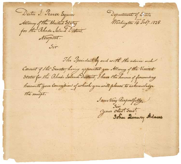 LS, one page, 8 x 7, February 14, 1825. Letter to Dutee J. Pearce, newly appointed U. S. Attorney. In full: “The President by and with the advise and consent of the Senate, having appointed you Attorney of the United States for the Rhode Island District, I have the honour of forwarding herewith your commission of which you will please to acknowledge the receipt.” A vertical tear between middle and last name of signature, partial separations along fragile folds, several small areas of edge chipping, light overall toning, a bit heavier at edges, and a couple trivial spots of ink erosion, otherwise very good albeit fragile condition. The document would benefit from professional restoration, as Adams’s signature remains quite bold and unaffected, and all writing is dark and readable.