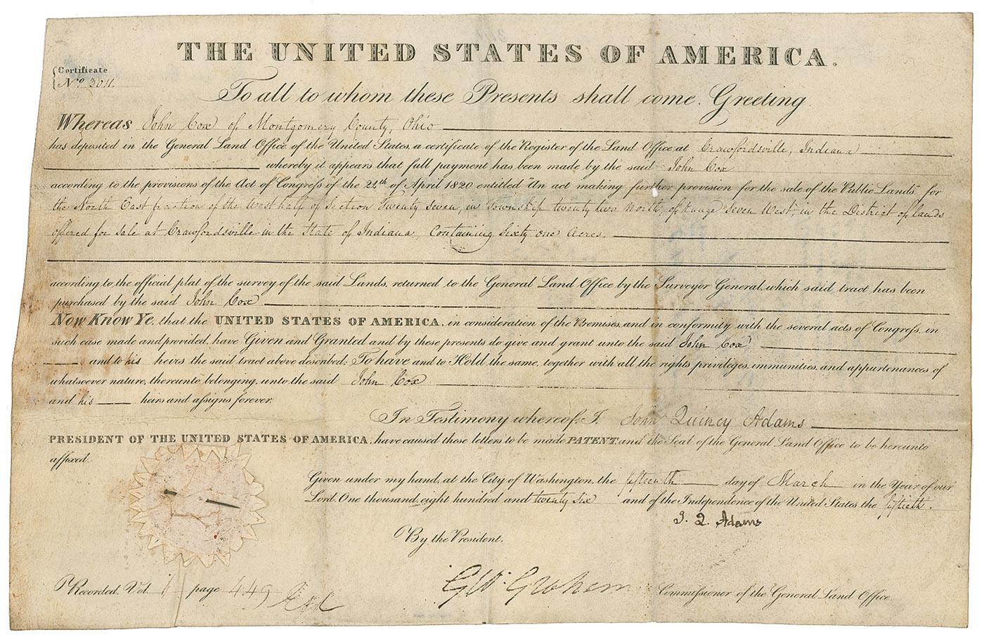 Partly-printed DS as president, signed “J. Q. Adams,” one page, 15.5 x 10, March 15, 1826. President Adams grants John Cox 61 acres of land in Indiana. Signed at the conclusion in black ink by Adams, and countersigned by Commissioner of the General Land Office George Graham. In very good condition, with intersecting storage folds, scattered toning and wrinkling, and a trimmed left edge. The white seal is worn and creased but intact, with a pin through the center, and Adams’s signature remains clear and dark. Pre-certified John Reznikoff/PSA/DNA and RRAuction COA.