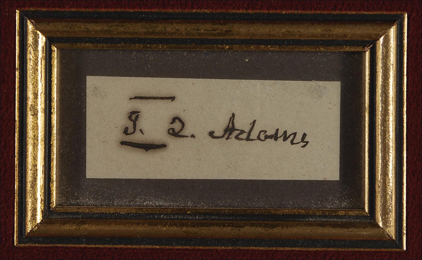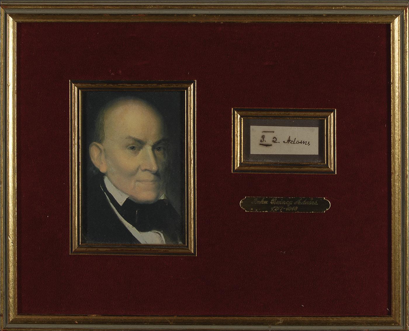 Ink signature, “J. Q. Adams,” on an off-white 2.25 x 1 clipped slip. Cloth matted and framed with a color portrait and a name plaque, to an overall size of 14.5 x 11.25. Some scattered light toning and a few wrinkles, otherwise fine condition. Pre-certified John Reznikoff/PSA/DNA and RRAuction COA.
