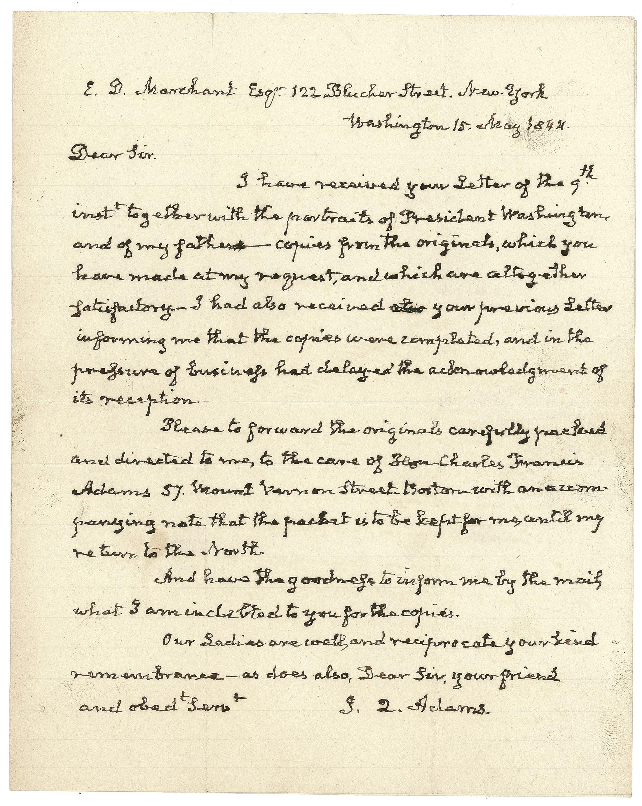 ALS signed “J. Q. Adams,” 8 x 10, May 15, 1844. Letter to portrait artist Edward Dalton Marchant regarding copies of paintings of his father John Adams and George Washington. In full: “I have received your letter of the 9th inst. Together with the portraits of President Washington and of my father—copies from the originals, which you have made at my request, and which are altogether satisfactory. I had also received your previous letter informing me that the copies were completed, and in the pressure of business had delayed the acknowledgment of its reception.