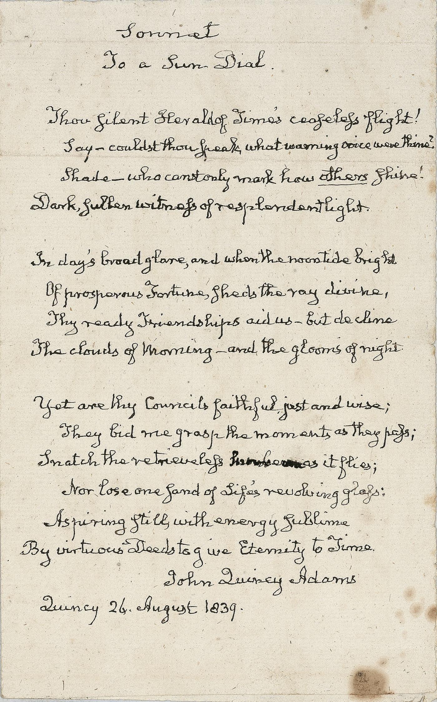 Original handwritten poem on a 4.75 x 7.5 off-white sheet, signed “John Quincy Adams,” entitled “Sonnet To A Sun-Dial,” and dated August 26, 1839. The poem reads, in full: