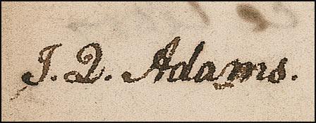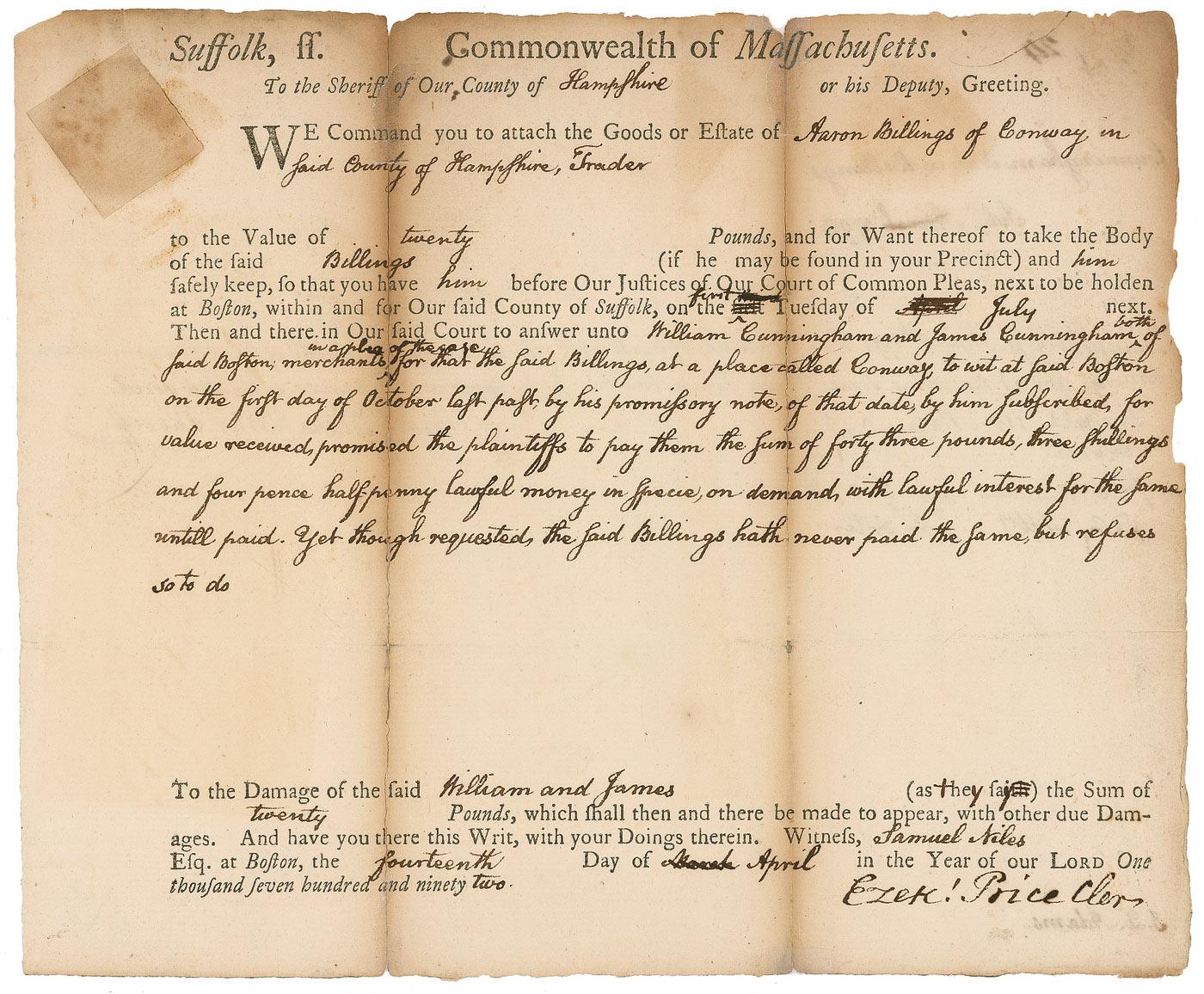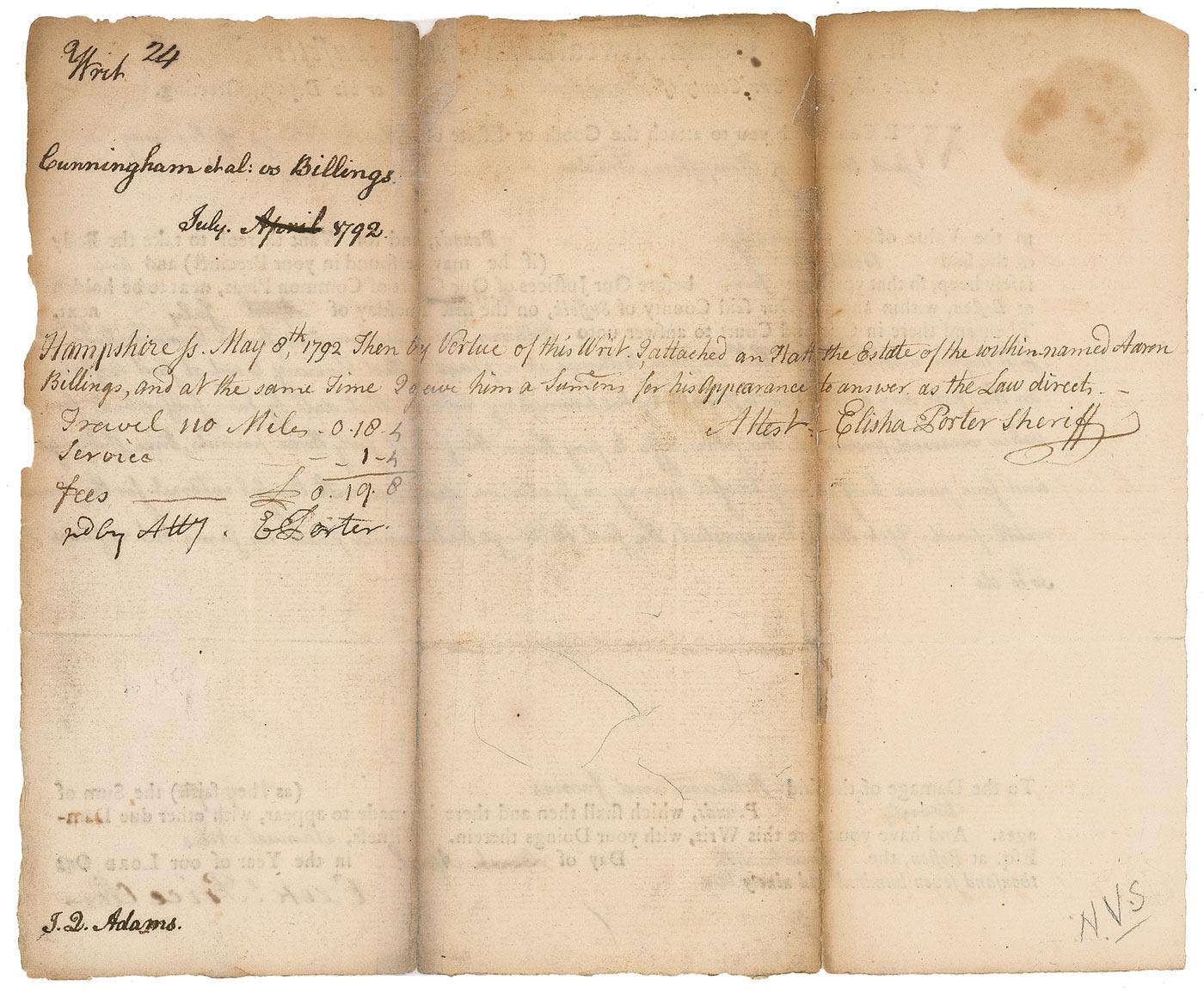 Partly-printed DS, signed “J. Q. Adams,” one page both sides, 8.25 x 7, April 14, 1792. An order for the sheriff of Hampshire County, Massachusetts, to have Aaron Billings appear in court to answer to William and James Cunningham for an unpaid promissory note. Signed on the reverse in black ink, “J. Q. Adams.” In very good condition, with intersecting folds, with professional repairs to two vertical folds, scattered toning and soiling, and a few edge chips. Adams’s signature is crisp and unaffected by any of the faults. After serving as an attorney for three years, George Washington would appoint Adams as minister to the Netherlands.