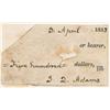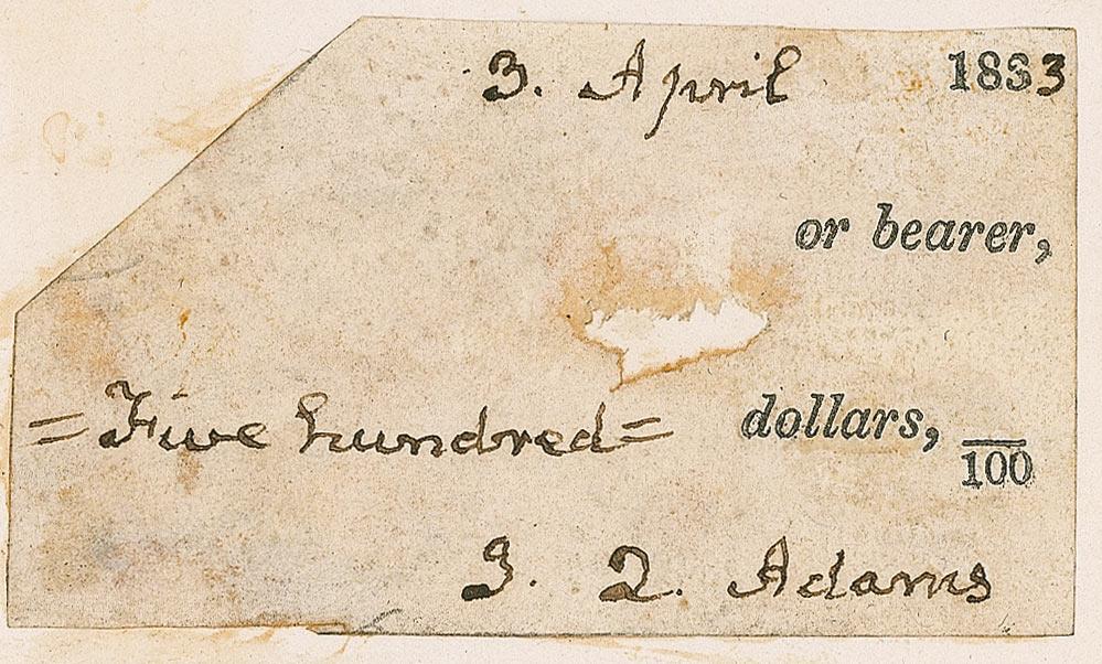 Partial check, 2.5 x 1.5, filled out and signed by Adams, “J. Q. Adams,” for $500.00, April 3, 1833. Check portion is affixed to a 5 x 4 off-white sheet. In very good condition, with trimmed edges and diagonal top left corner, paper loss to center, and scattered toning and soiling. On April 3, 1833 John Quincy Adams wrote a check to a John A. Smith for $500. According to his diaries, on April 2, John Quincy Adams ‘received an order from John A. Smith for the payment of 500 dollars of the bequest from my father to him-which I accepted.’ The following day Adams records how he walked ‘to the U.S. Branch Bank where my son had paid the draft of J. A. Smith for 500 dollars; and where I took my Bank Book that the entry might be made both to my debt and credit for a record of the transaction.’ Partially printed examples of early presidents are significantly rarer than their manuscript counterparts, with this check made even more desirable by being mentioned in his personal diary.