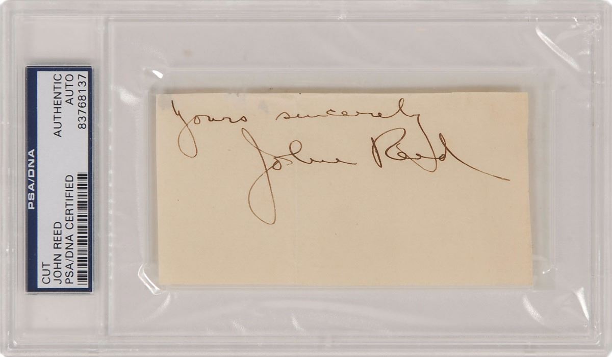 American journalist, poet, and socialist activist (1887–1920) known for his account of the Bolshevik Revolution, Ten Days That Shook the World. Ink signature, “Yours sincerely, John Reed,” on an off-white 4.25 x 2.25 slip. Encapsulated in a plastic PSA/DNA authentication holder. In fine condition.
